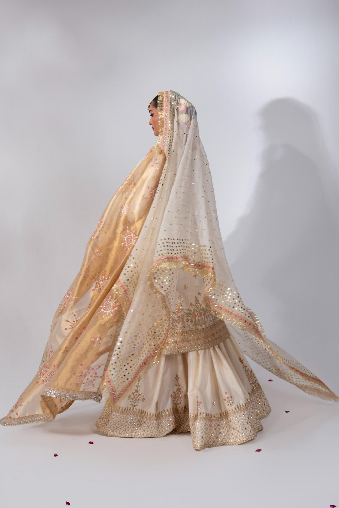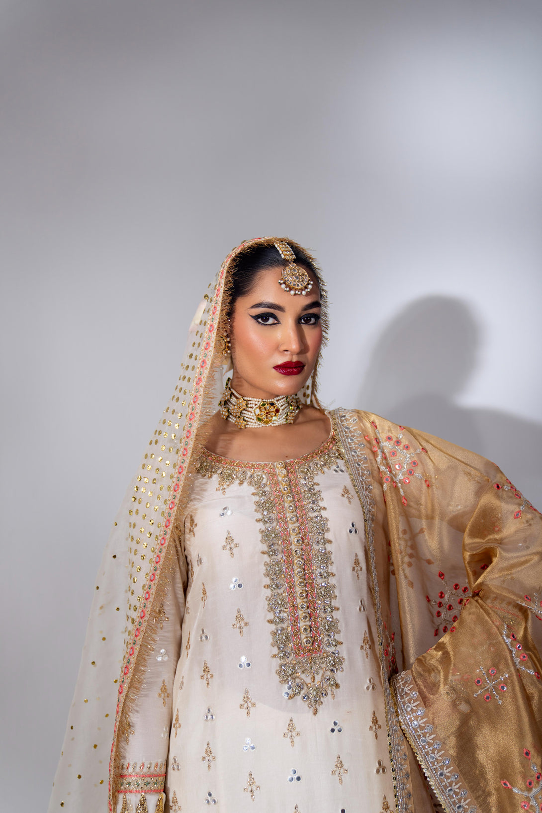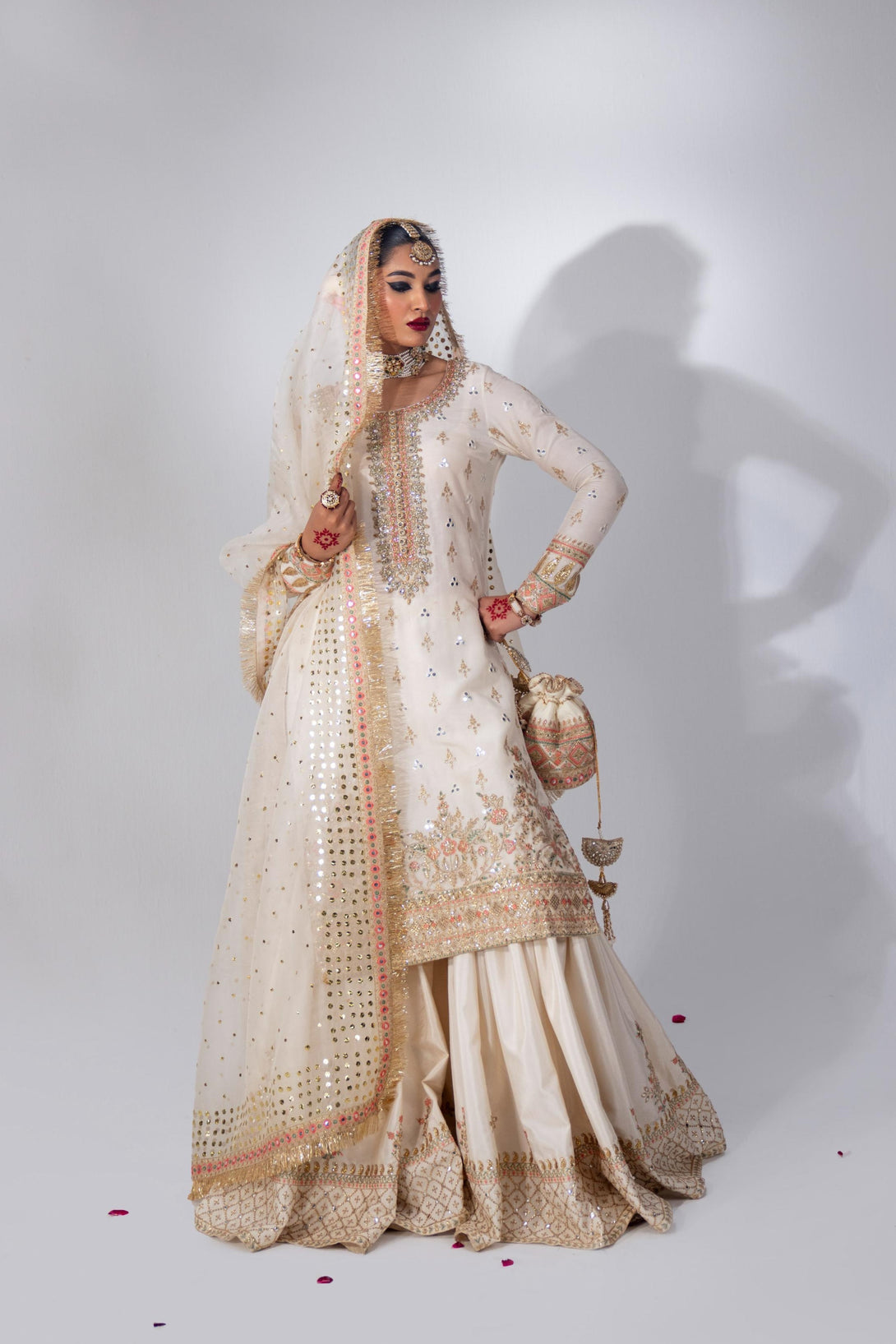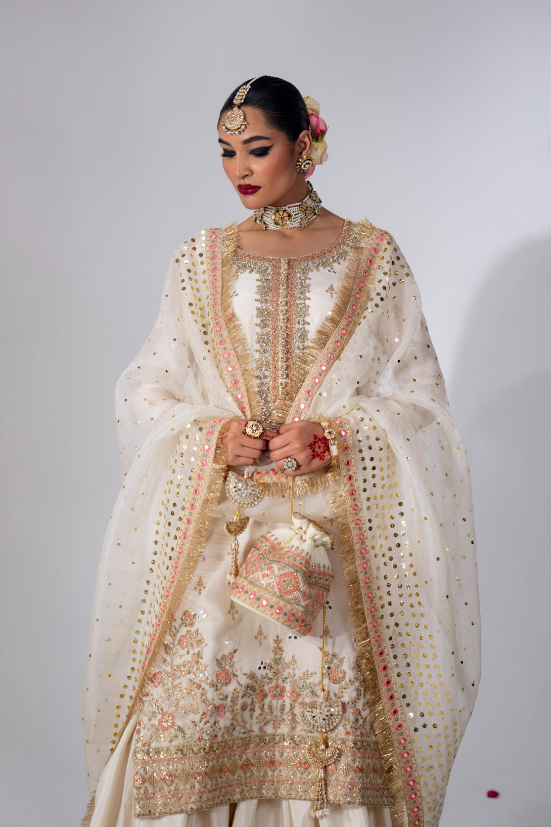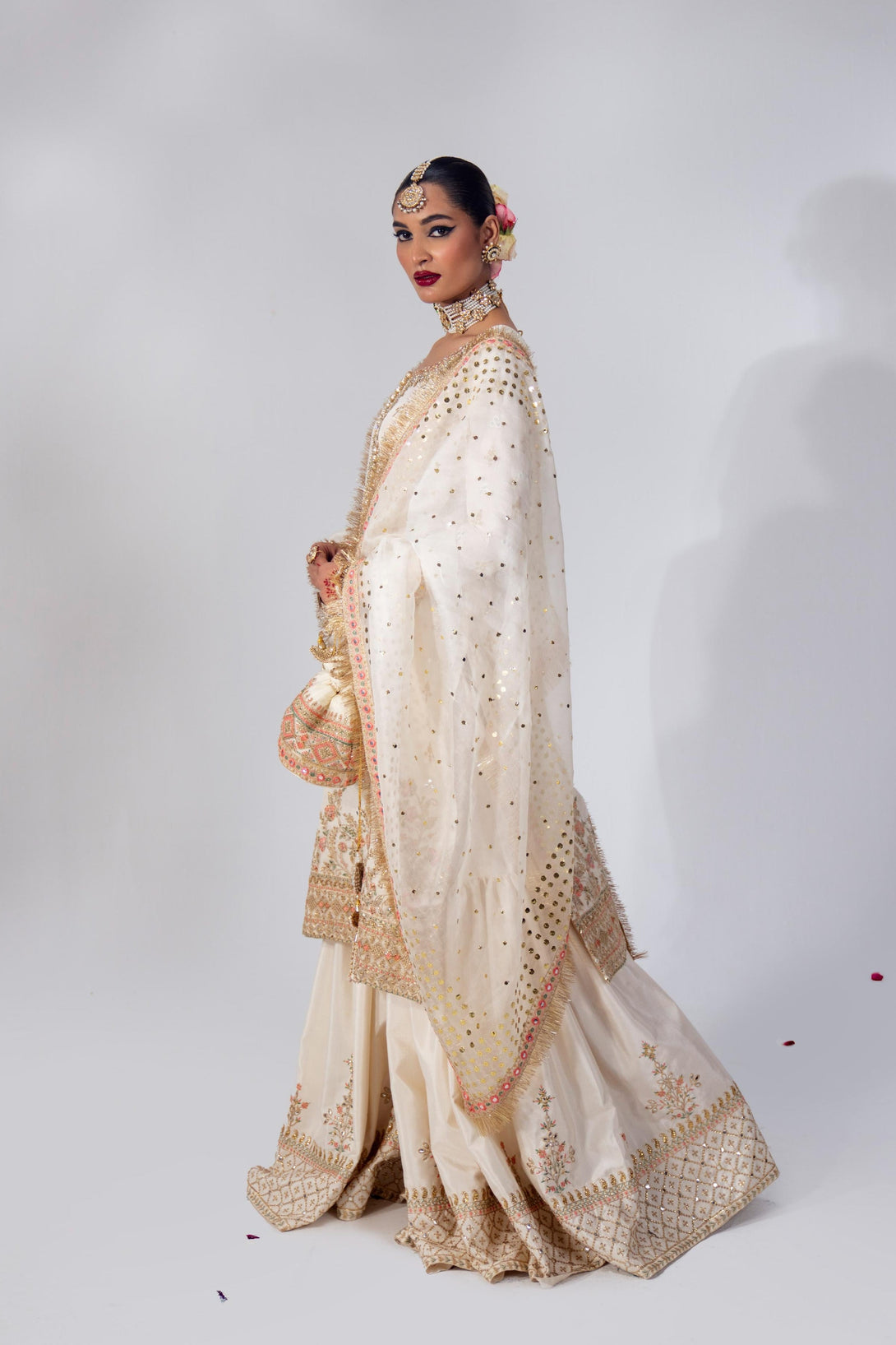Our signature ivory rawsilk kameez features a heavily hand embellished neckline with nakshi, dabka, crystals and sitari, crafted on an embroidered base. It is paired with a classic, voluminous gharara, intricately embroidered with panni and sequins. The outfit comes with a Pure Organza Mukaish dupatta