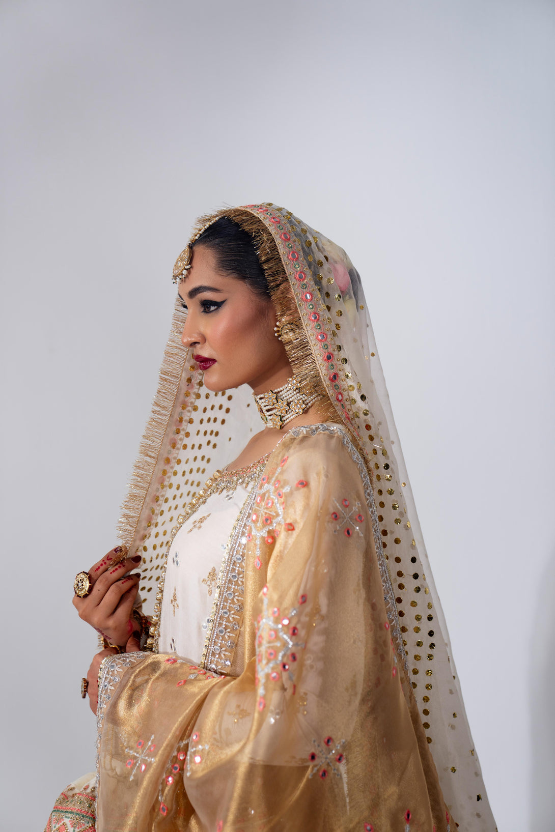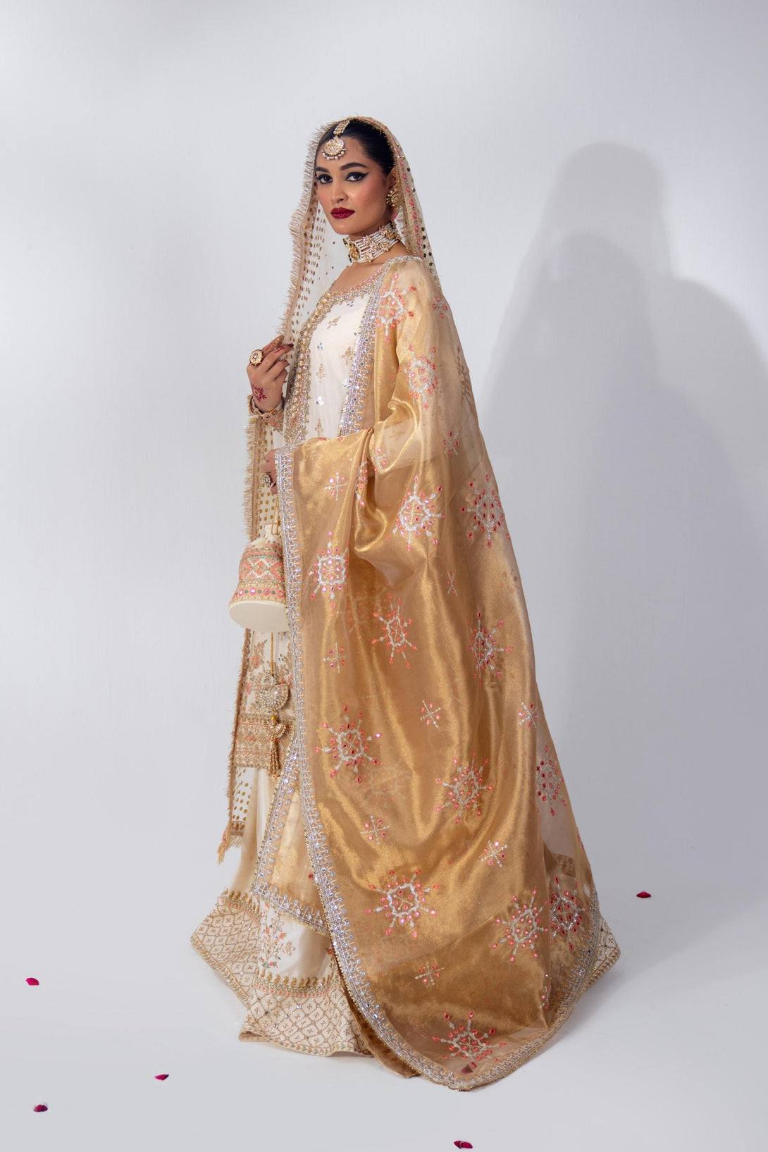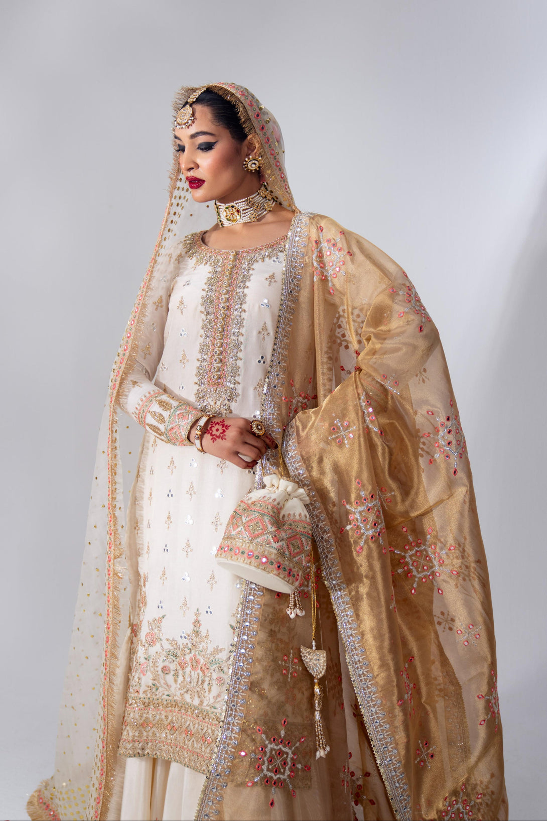 Perfect for Nikkah brides, you can complete the ensemble with a pure tissue gold shawl, featuring rich sequin and panni embroidery with intricate borders for added grandeur. A matching potli pouch can be added for a regal finish.
