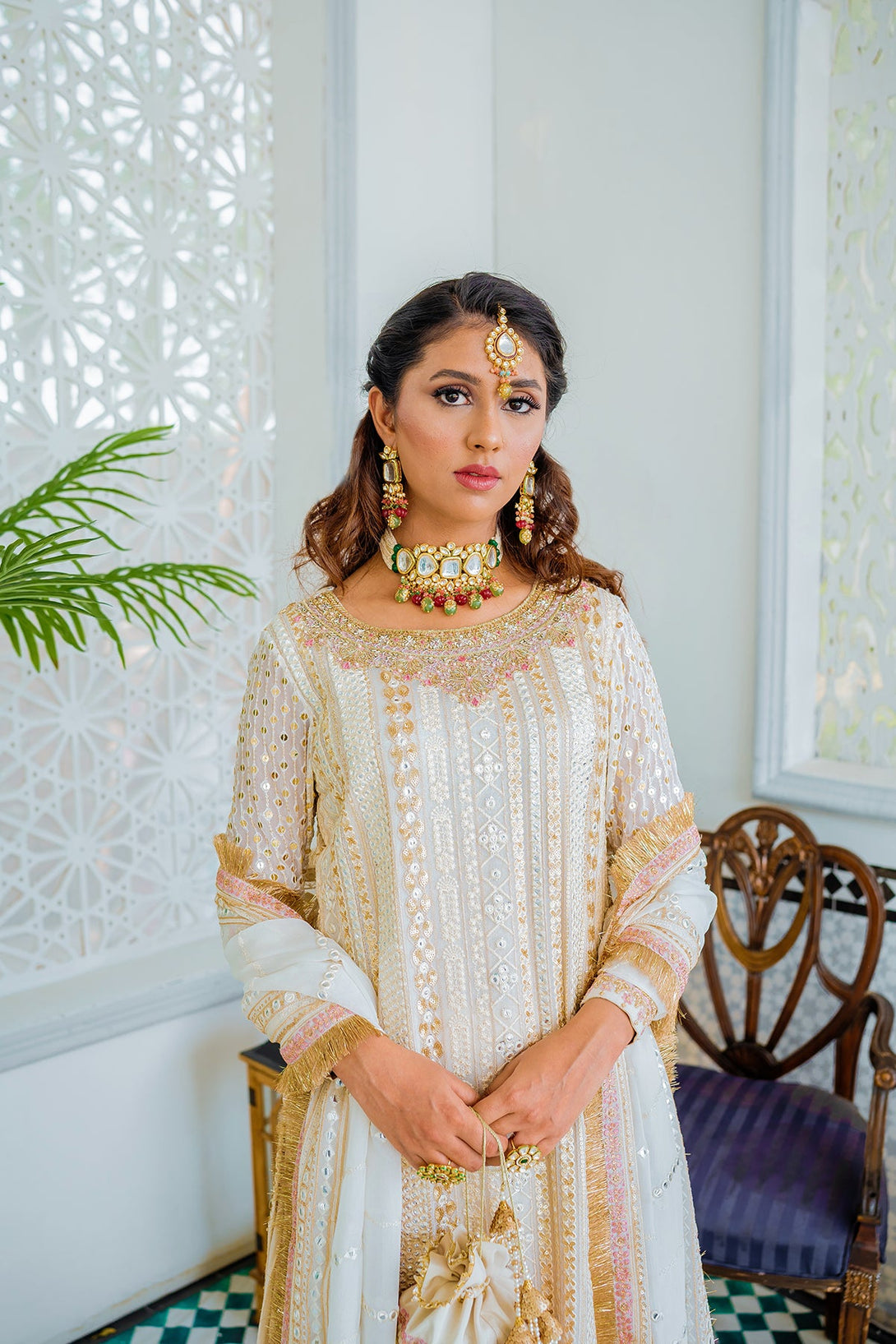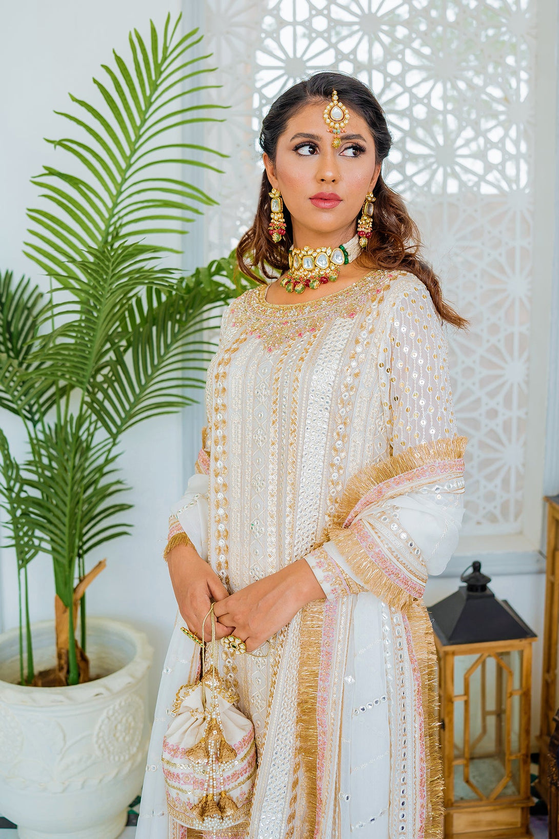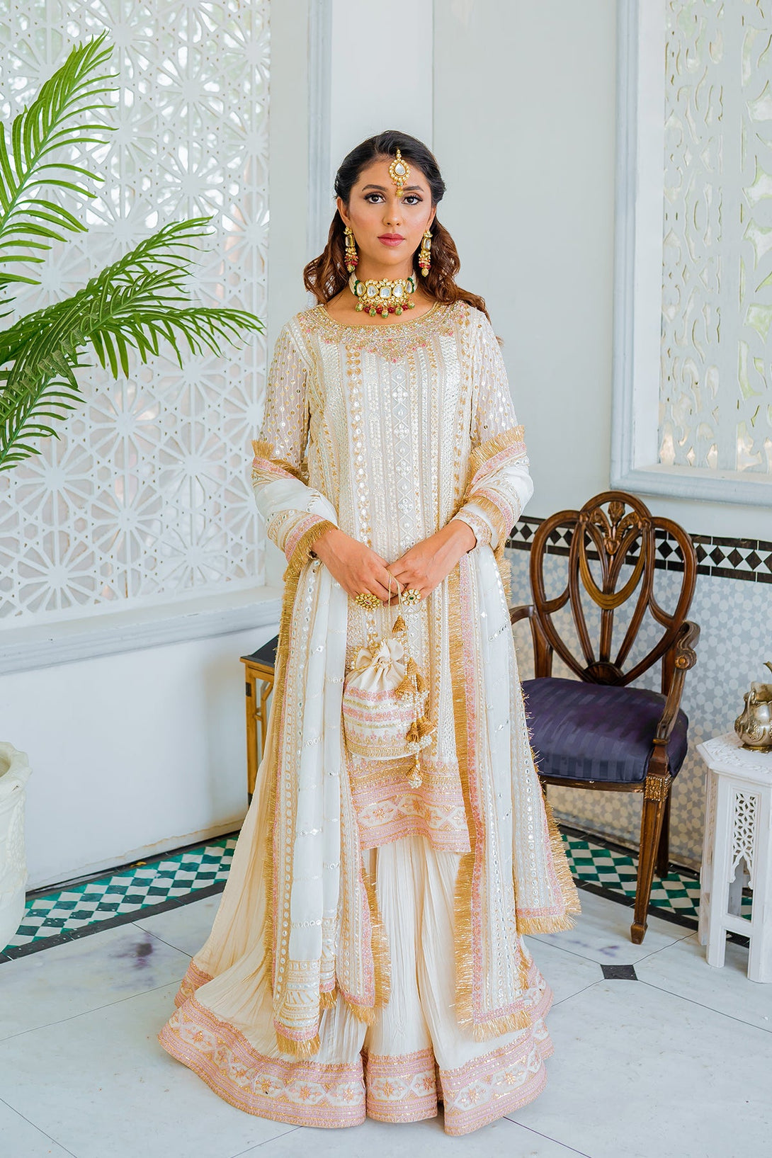 - Dupatta: Embroidered, sequined, and panni-worked chiffon dupatta with kiran edging.