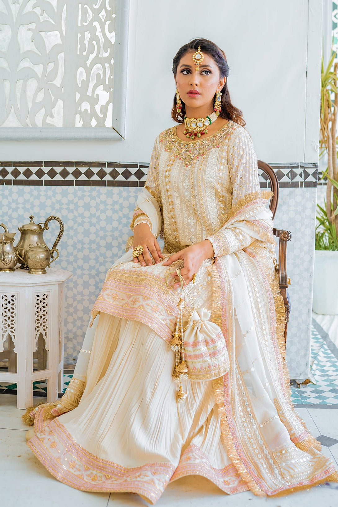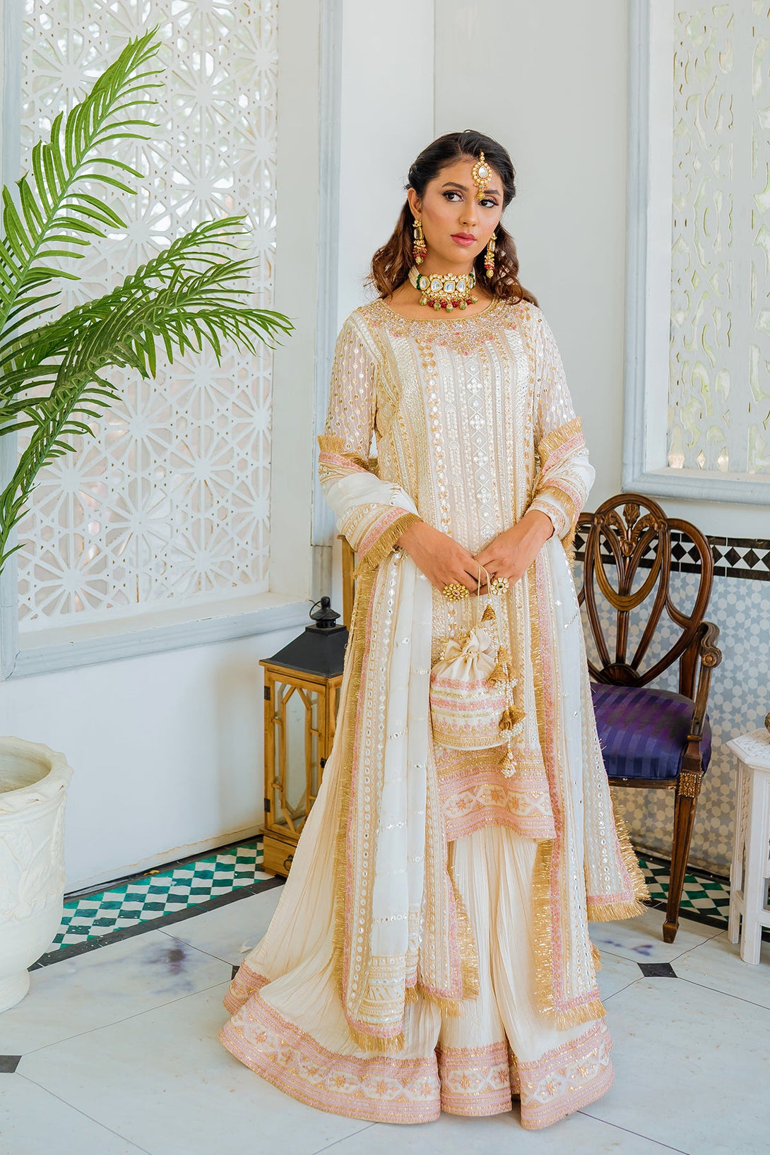 - Sharara: Crushed sharara in silk with embroidered borders.