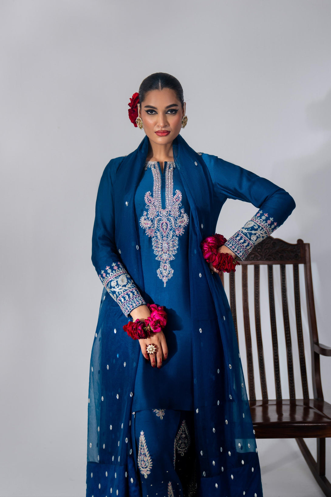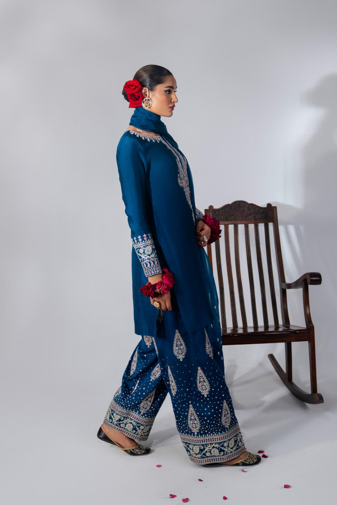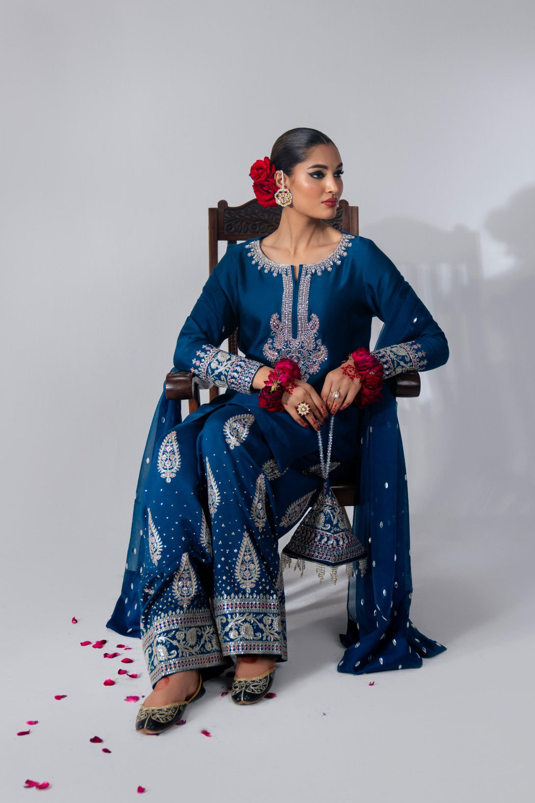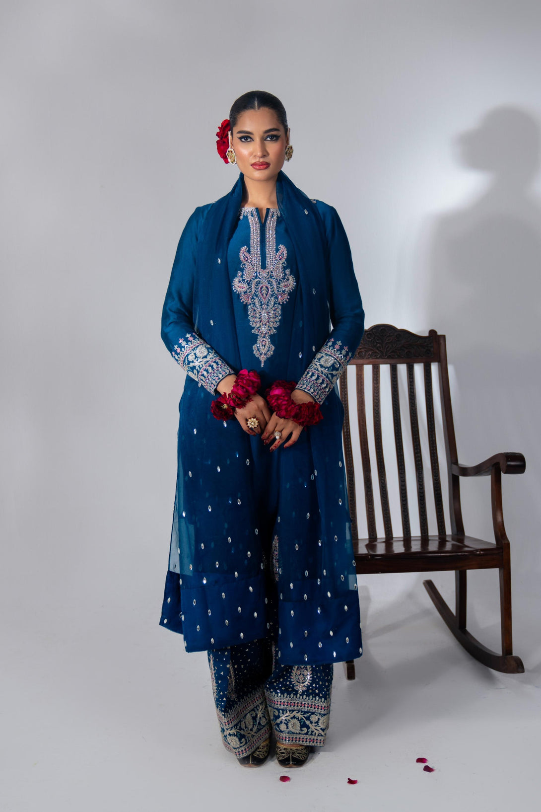 This yale blue farshi shalwar kameez set is crafted from luxurious Roman Silk, featuring a hand-embellished neckline and intricate embroidery. The farshi shalwar is adorned with traditional ethnic sequin embroidery. It comes with a matching organza dupatta, finished with silk and a dazzling diamante spray. A modern potli bag completes the look with a contemporary flair.