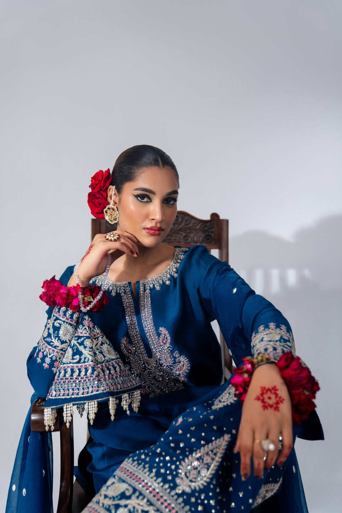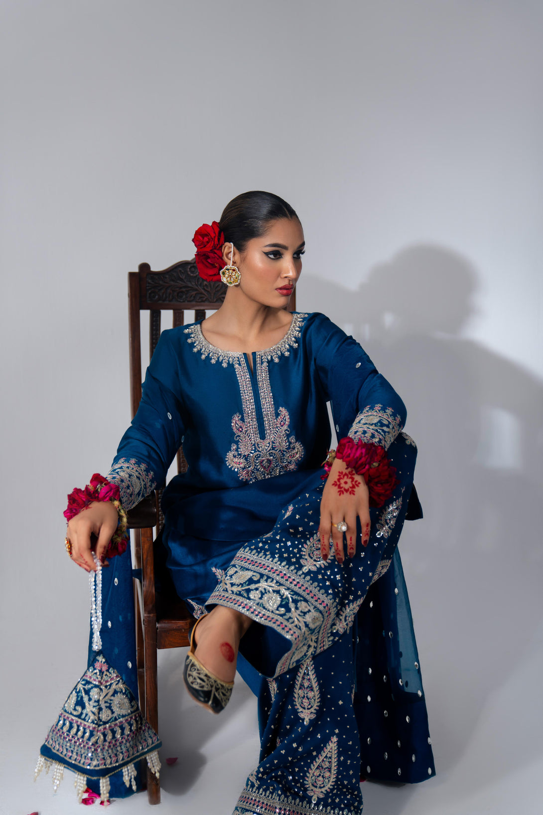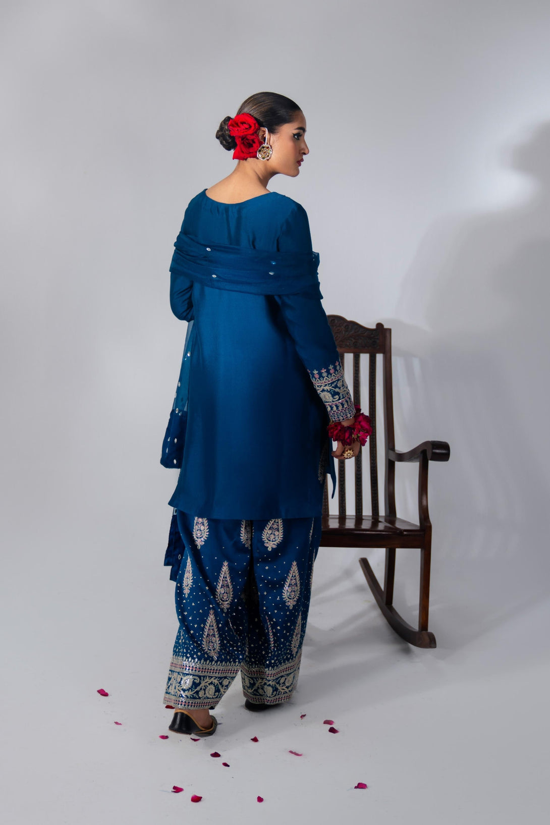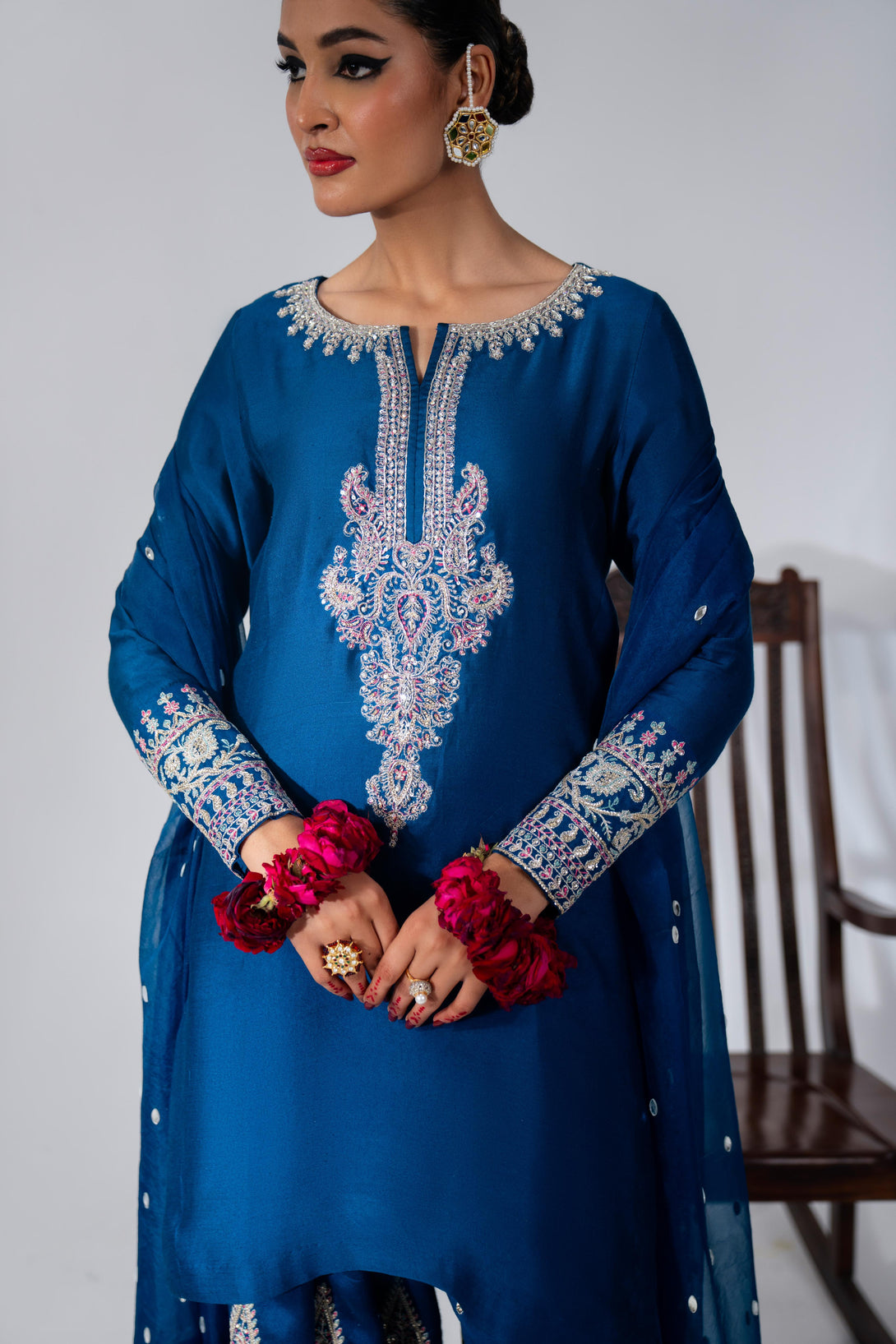 This yale blue farshi shalwar kameez set is crafted from luxurious Roman Silk, featuring a hand-embellished neckline and intricate embroidery. The farshi shalwar is adorned with traditional ethnic sequin embroidery. It comes with a matching organza dupatta, finished with silk and a dazzling diamante spray. A modern potli bag completes the look with a contemporary flair.