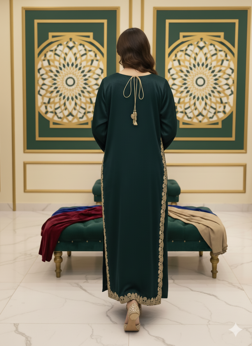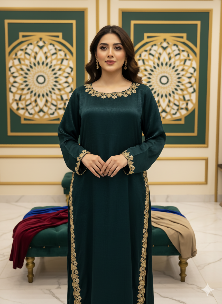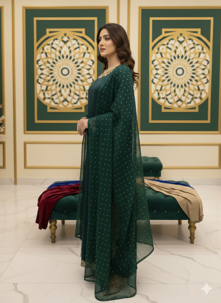 Meena Kari is an emerald green velvet silk outfit featuring intricate embroidery on the gala, daman, and chaak on both (front & back). It also boasts tussle hangings at the back. This stunning ensemble is paired with baggy pants made from the same fabric and a matching chiffon dupatta adorned with all-over chan (sequins) work.