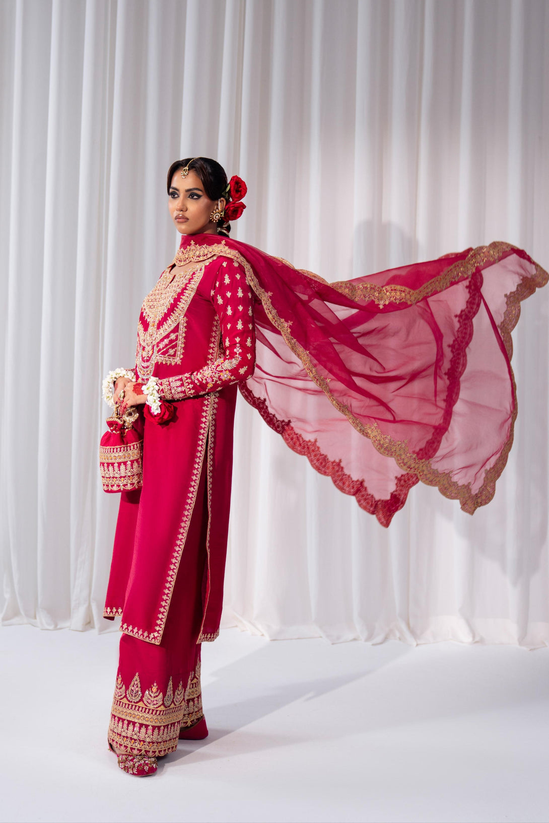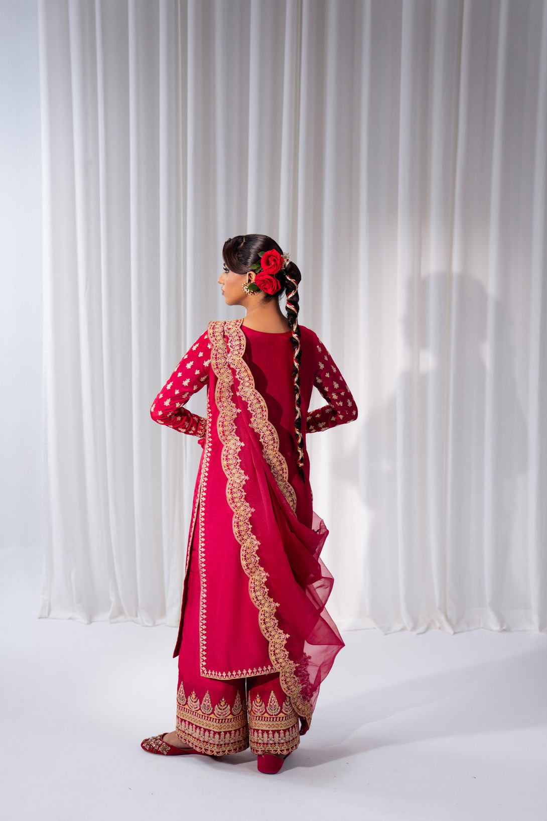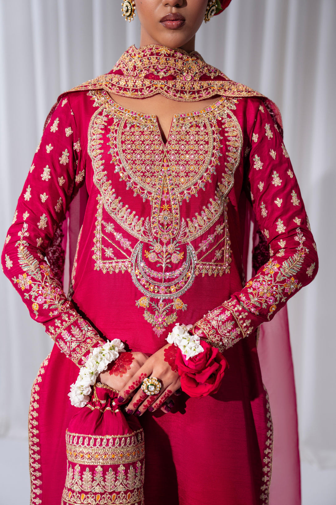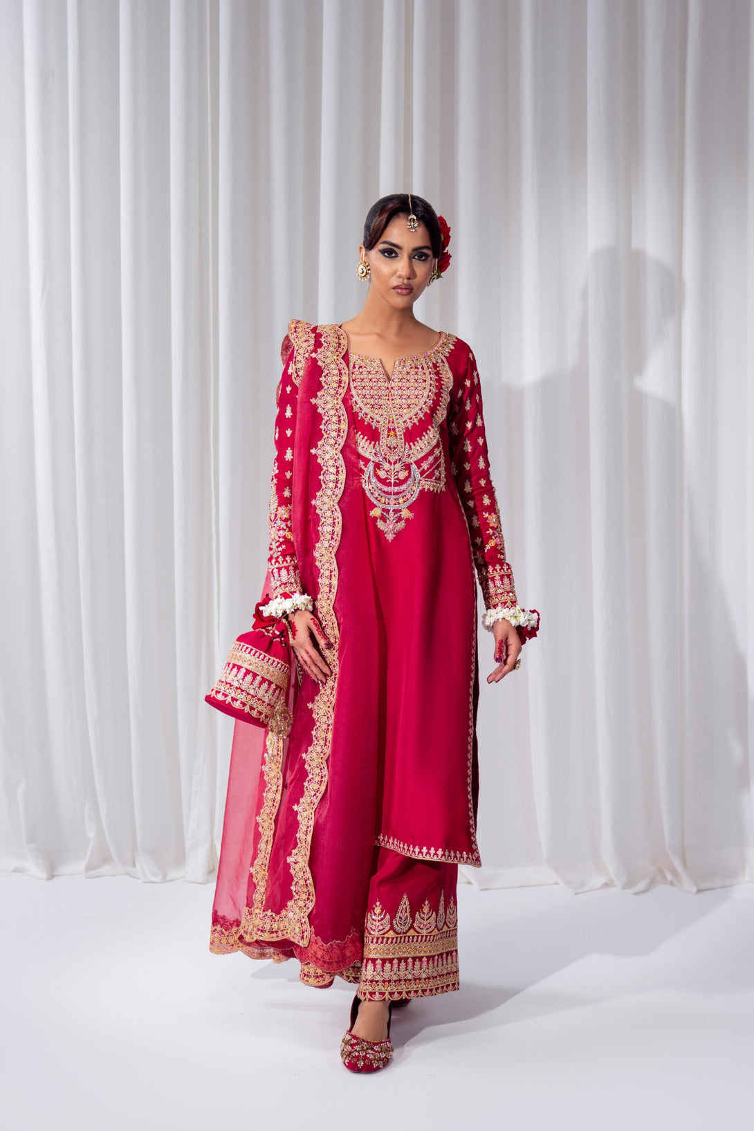 This stunning Ruby Pink ensemble features a rawsilk shirt with hand embellishment and rich embroidery. It is paired with embroidered pants and an organza dupatta with four-sided scalloped embroidered borders. Add a matching potli bag to complete your festive look.