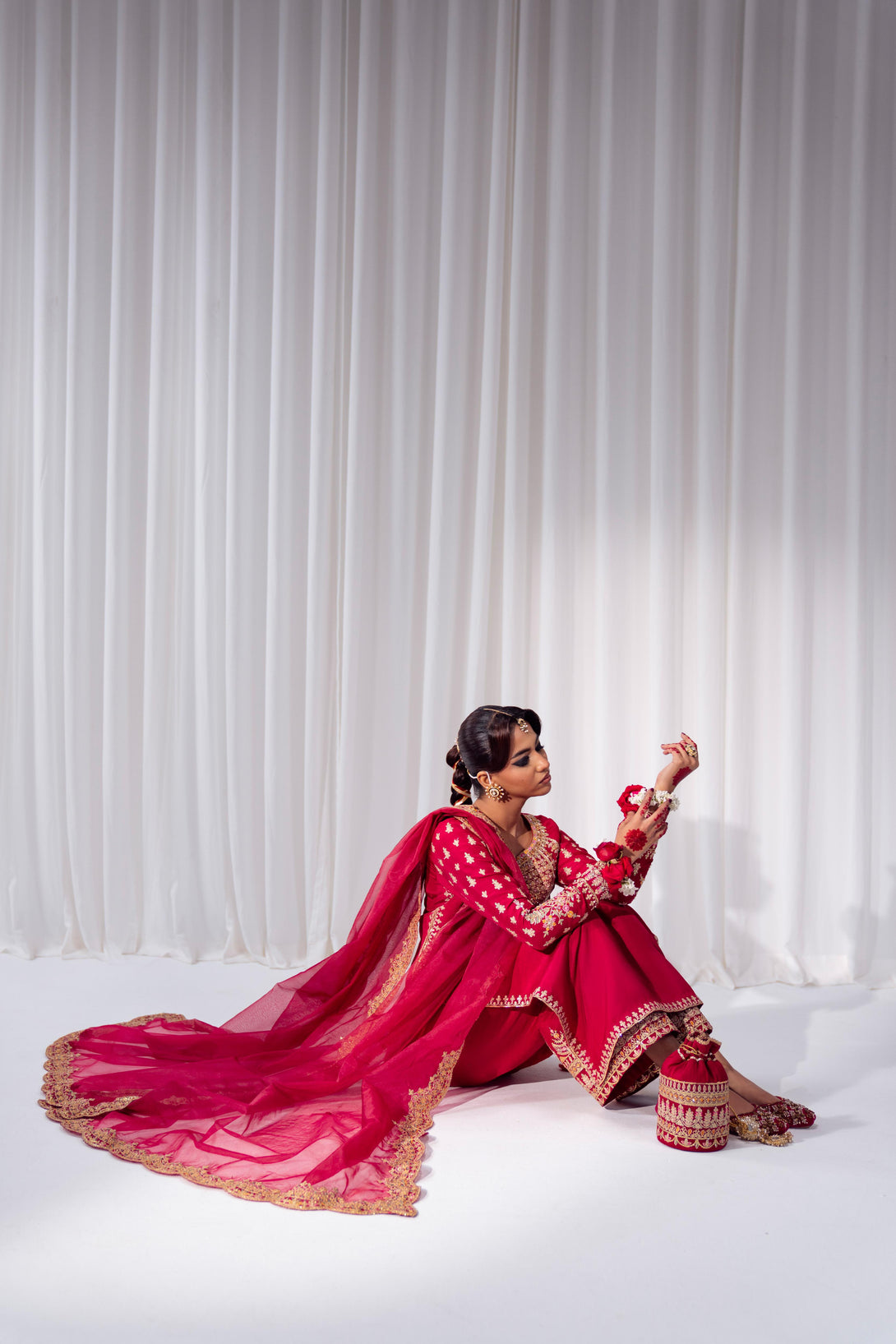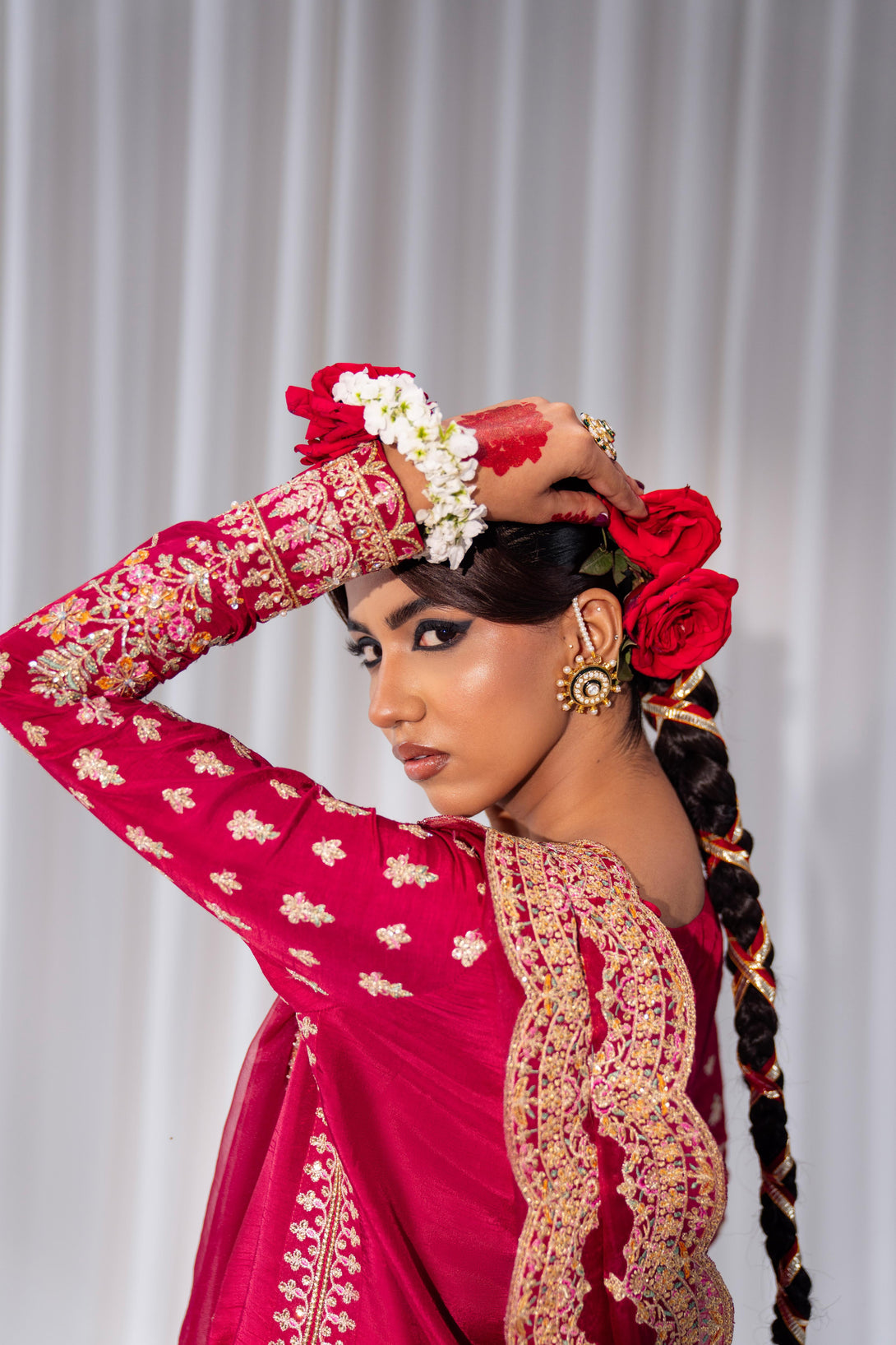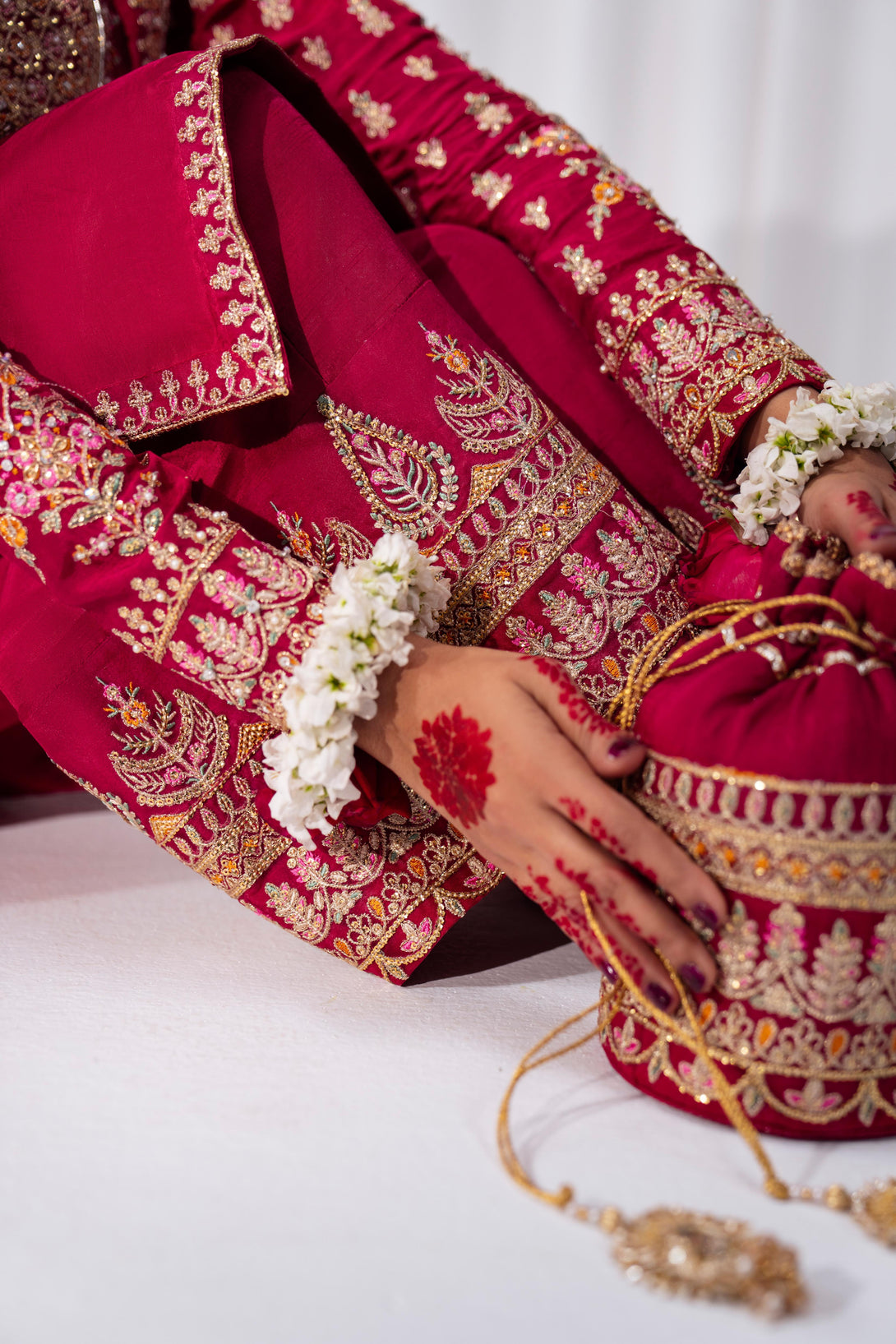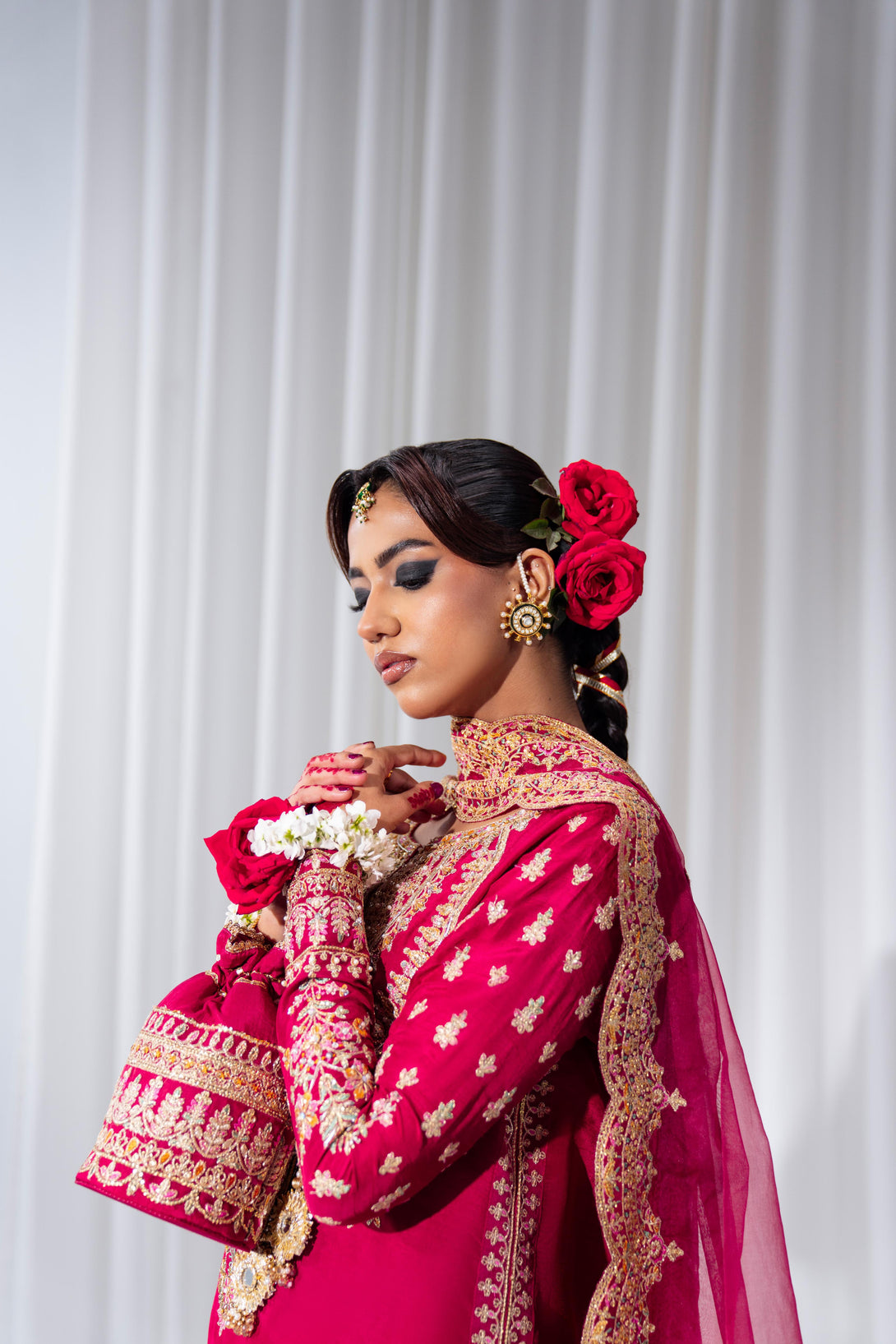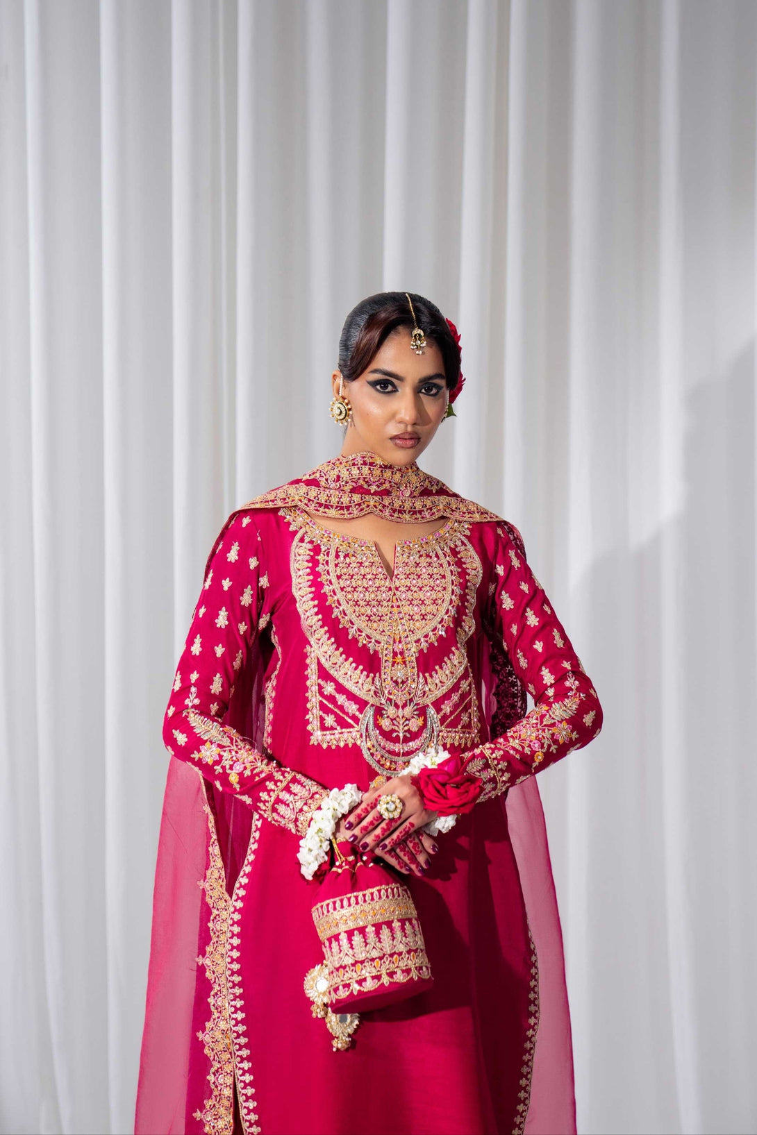 This stunning Ruby Pink ensemble features a rawsilk shirt with hand embellishment and rich embroidery. It is paired with embroidered pants and an organza dupatta with four-sided scalloped embroidered borders. Add a matching potli bag to complete your festive look.