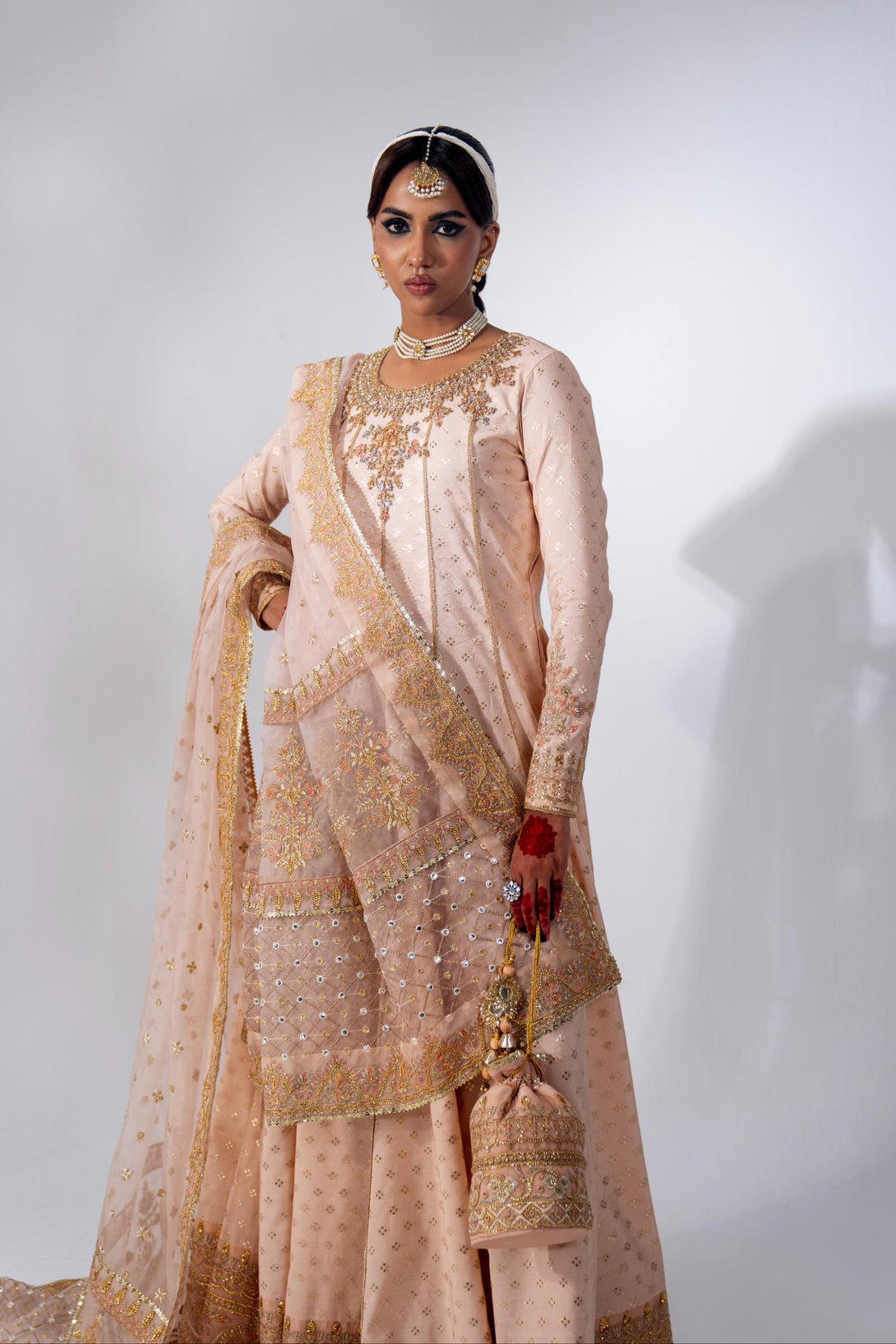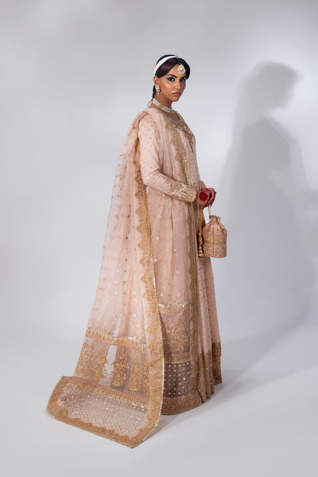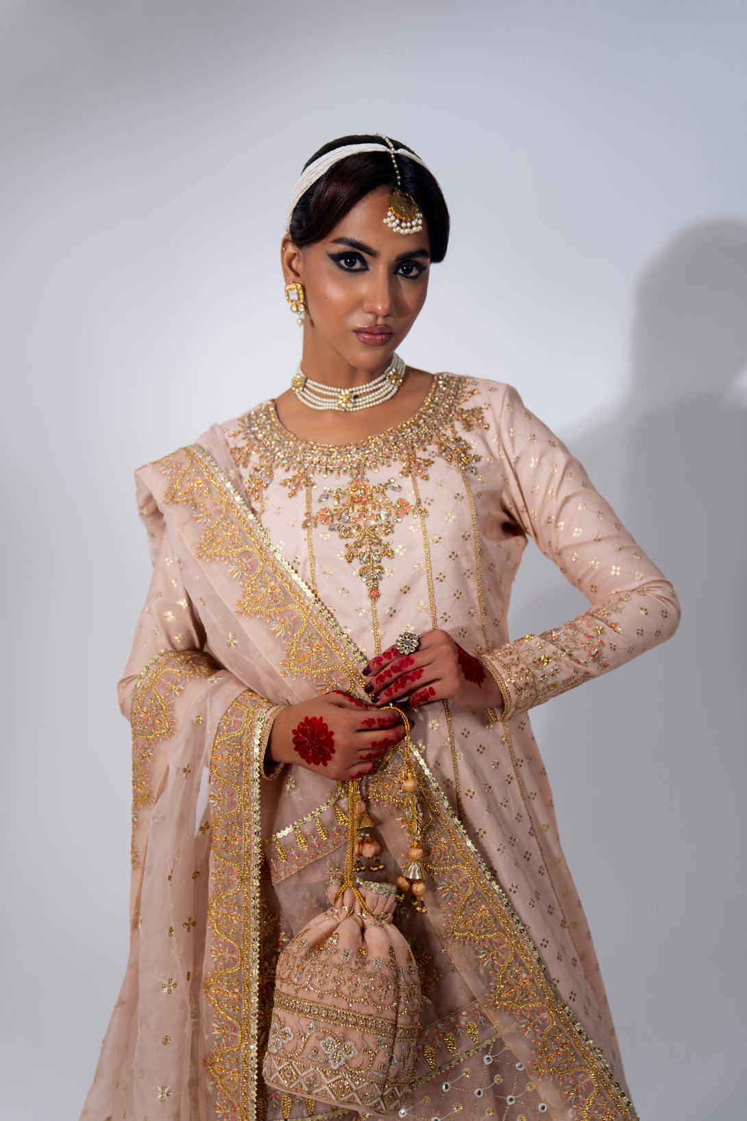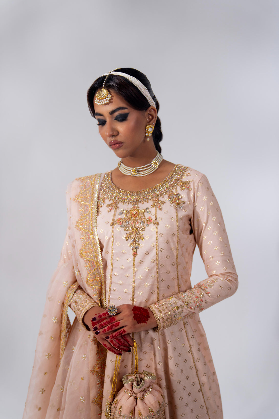 Embrace timeless elegance with this classic powder pink pishwas, beautifully hand-embellished and embroidered to perfection. The traditional kalidaar silhouette is crafted from luxurious badla Banarsi fabric, with flowing panels that exude regal charm. The neckline is a true masterpiece, adorned with meticulous hand embellishments featuring nakshi, dabka, pearls, crystals, and sitari. Paired with a heavily embroidered composed organza dupatta, this ensemble is the epitome of grace and grandeur. Complete the look with a matching potli bag for an effortlessly regal finish.