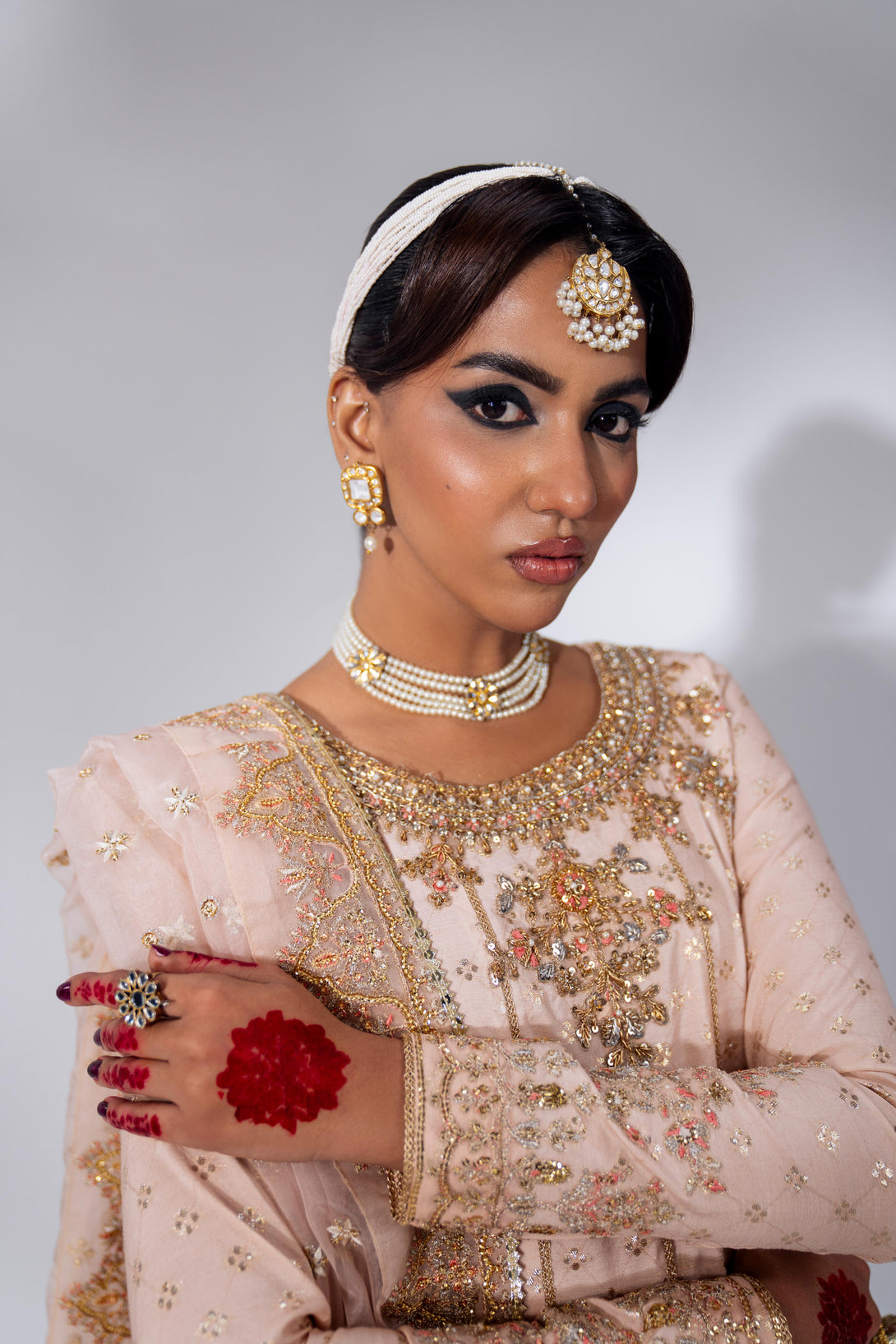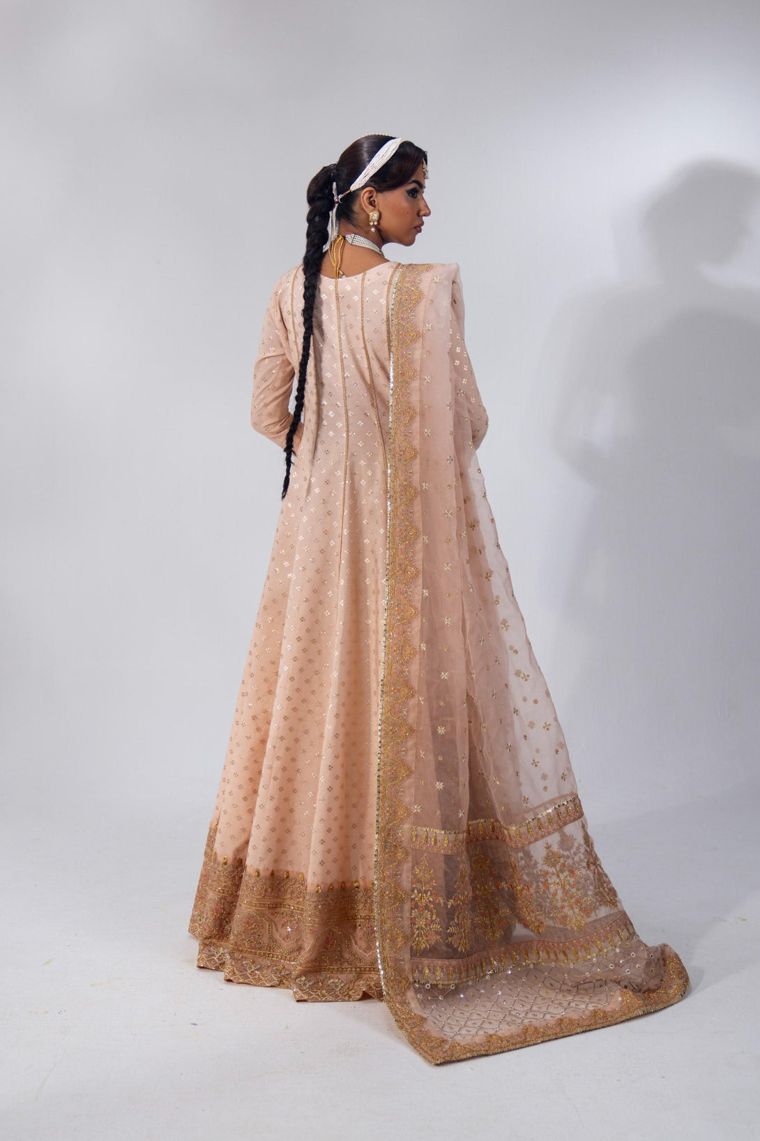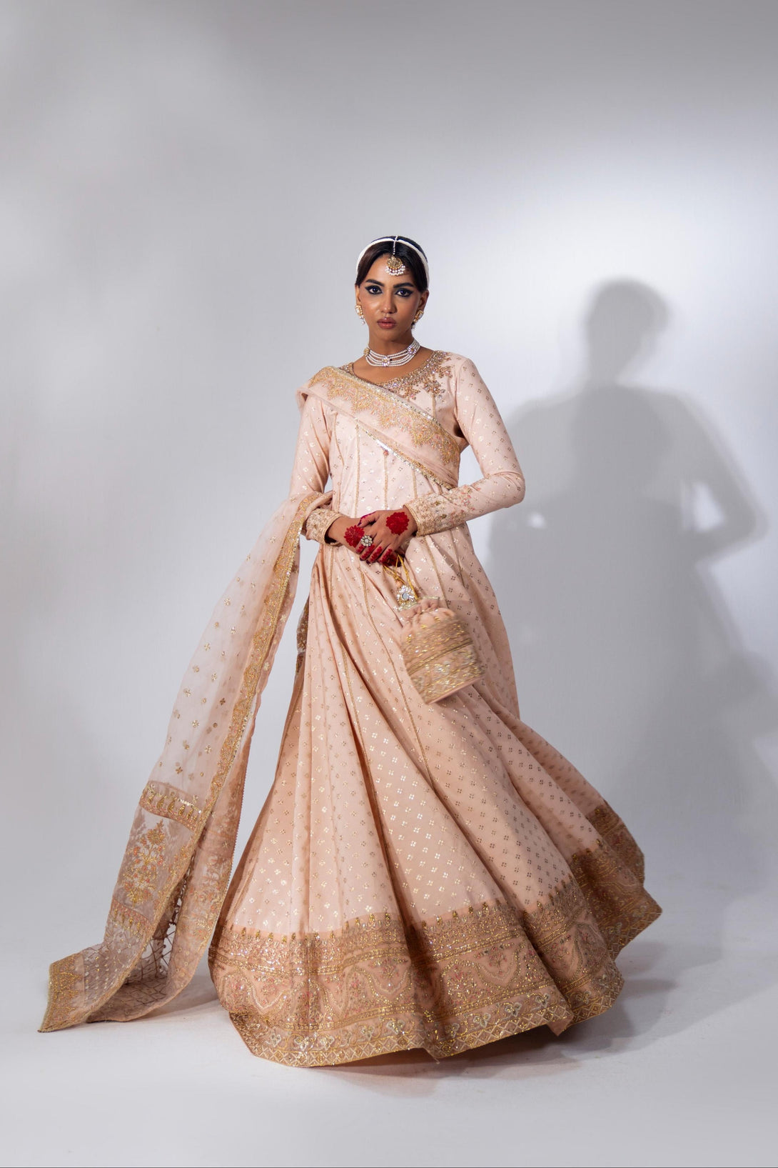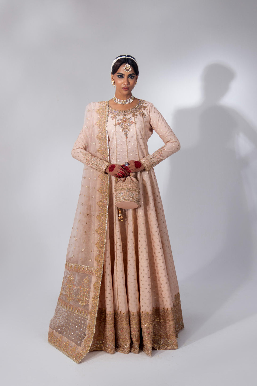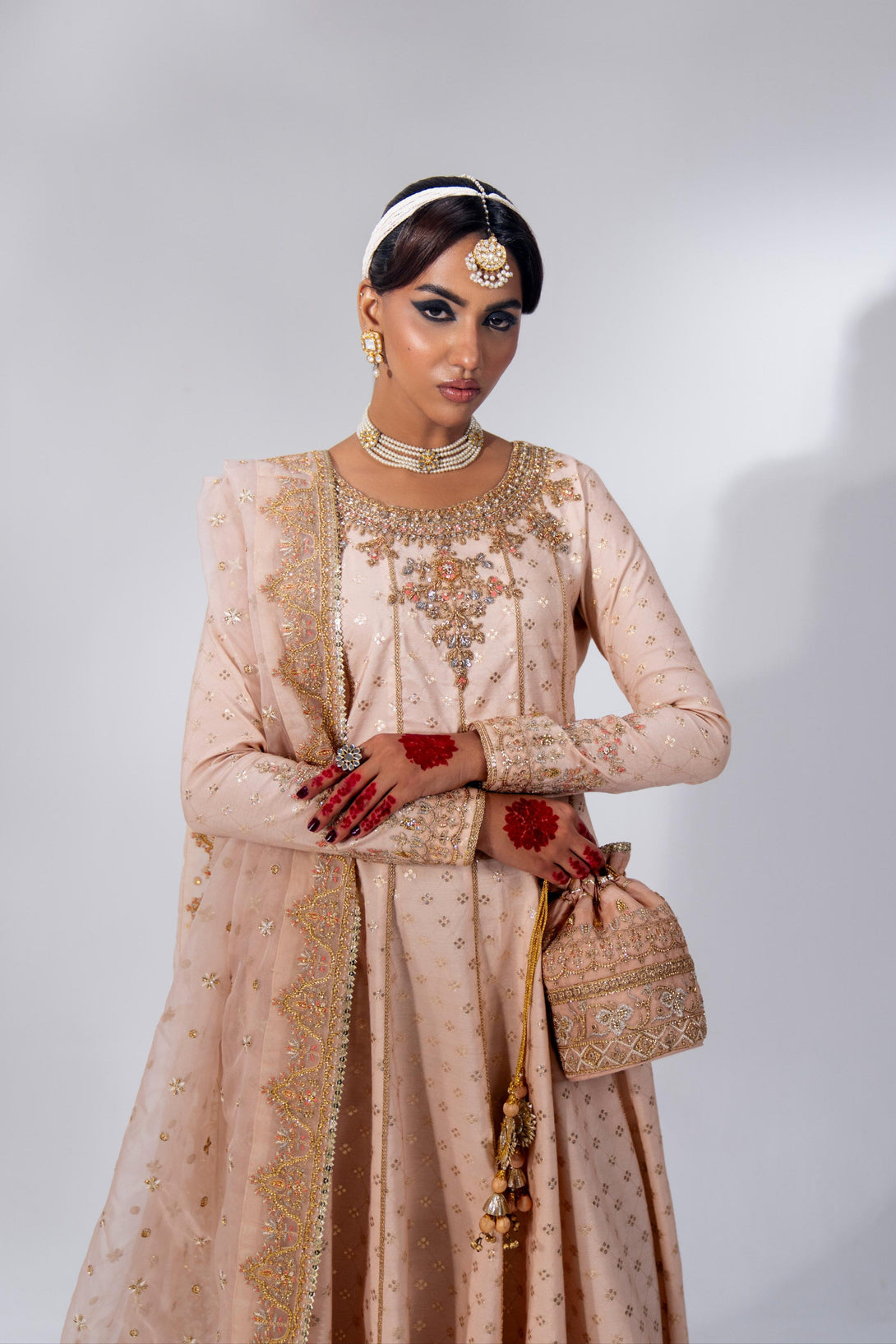 Embrace timeless elegance with this classic powder pink pishwas, beautifully hand-embellished and embroidered to perfection. The traditional kalidaar silhouette is crafted from luxurious badla Banarsi fabric, with flowing panels that exude regal charm. The neckline is a true masterpiece, adorned with meticulous hand embellishments featuring nakshi, dabka, pearls, crystals, and sitari. Paired with a heavily embroidered composed organza dupatta, this ensemble is the epitome of grace and grandeur. Complete the look with a matching potli bag for an effortlessly regal finish.