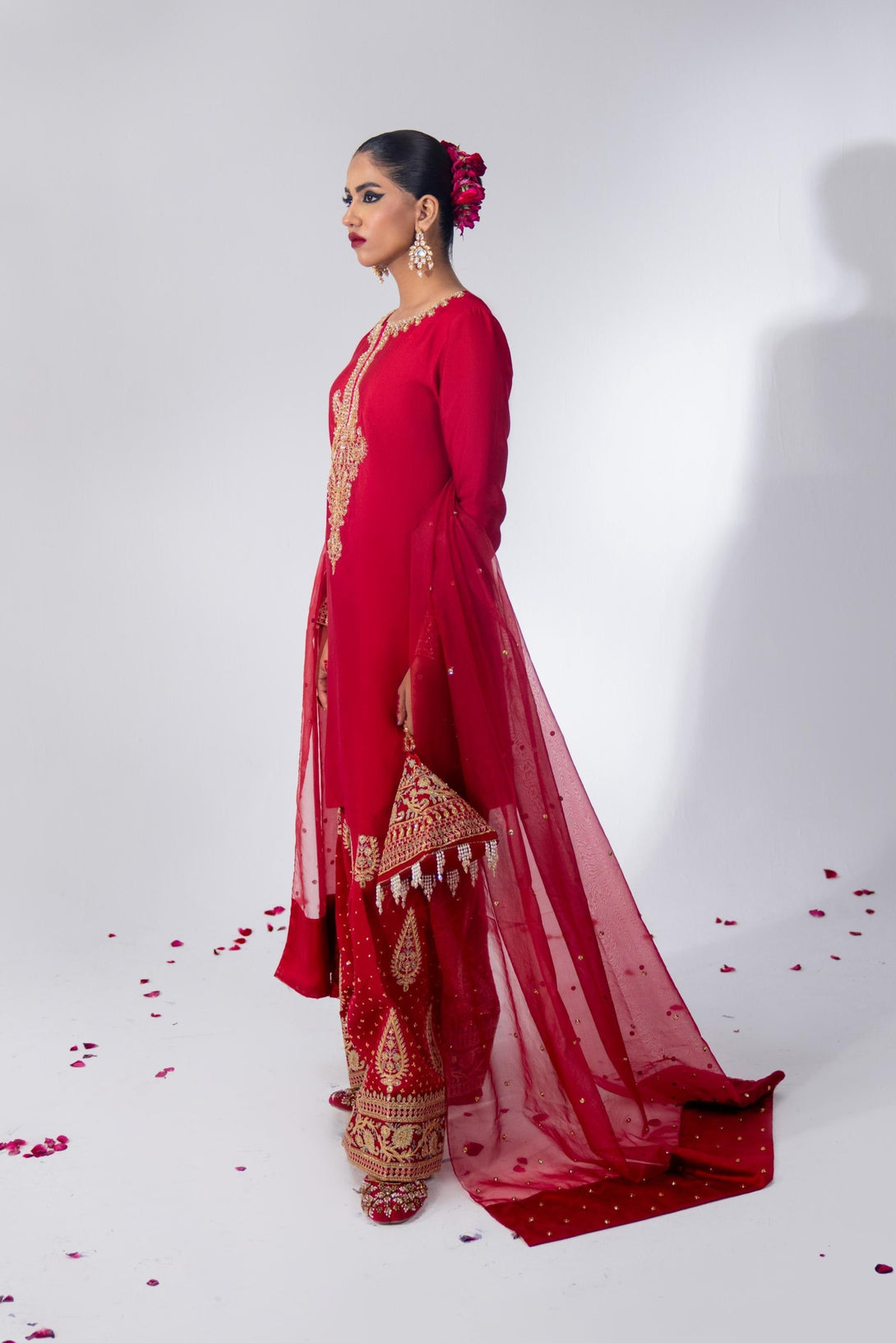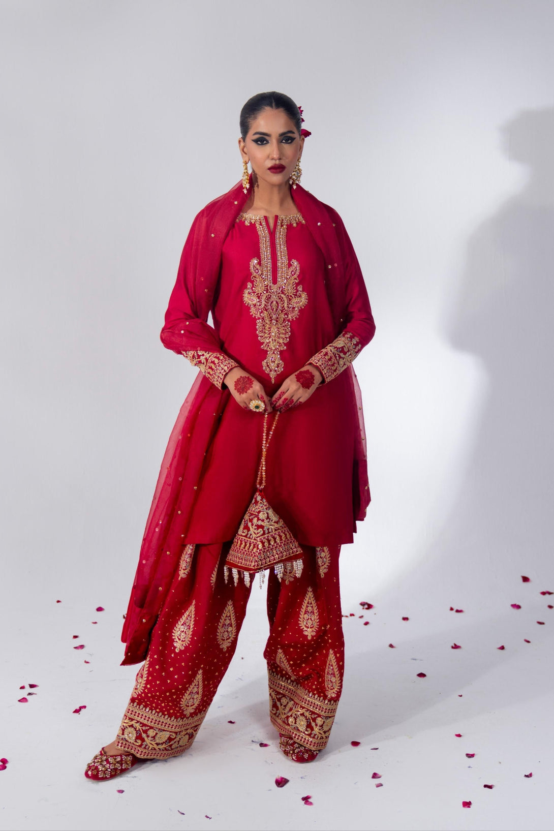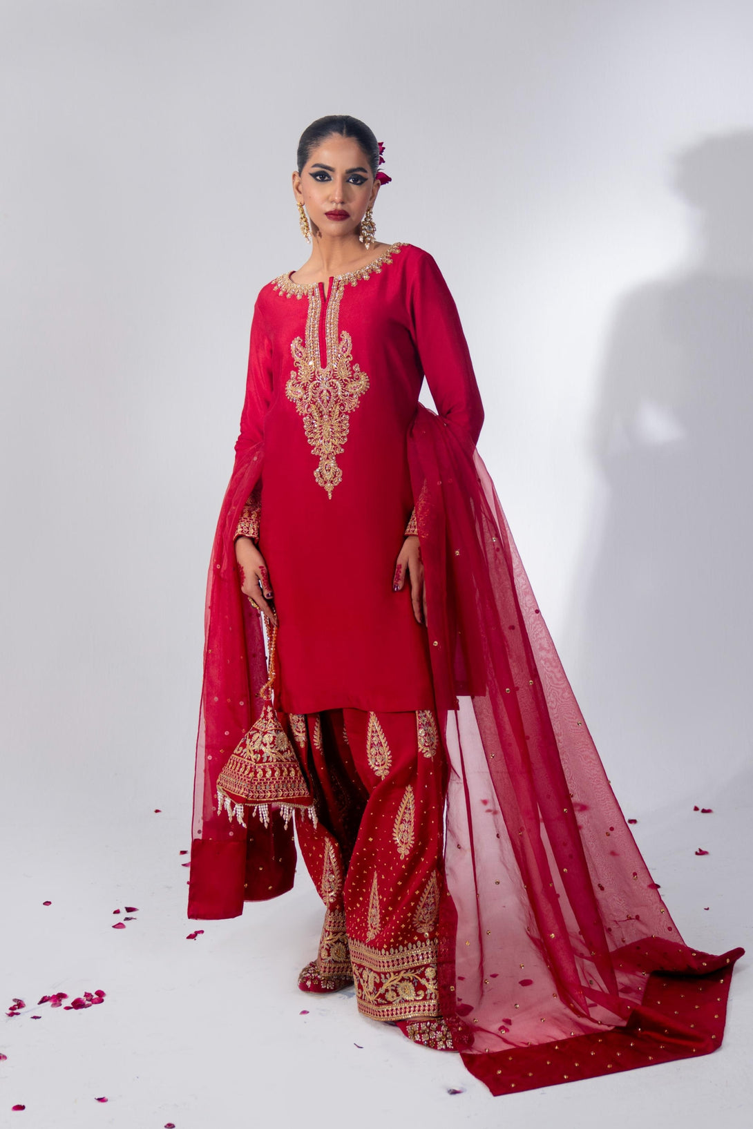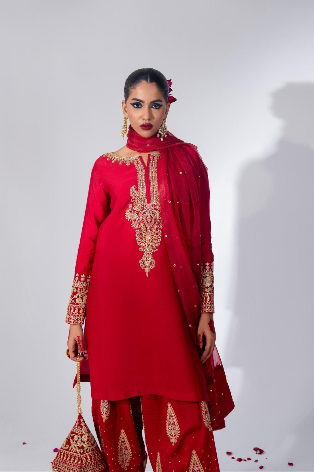 This cool red farshi shalwar kameez set is crafted from luxurious Roman Silk, featuring a hand-embellished neckline and intricate embroidery. The farshi shalwar is adorned with traditional ethnic sequin embroidery. It comes with a matching organza dupatta, finished with silk and a dazzling diamante spray. A modern potli bag completes the look with a contemporary flair.