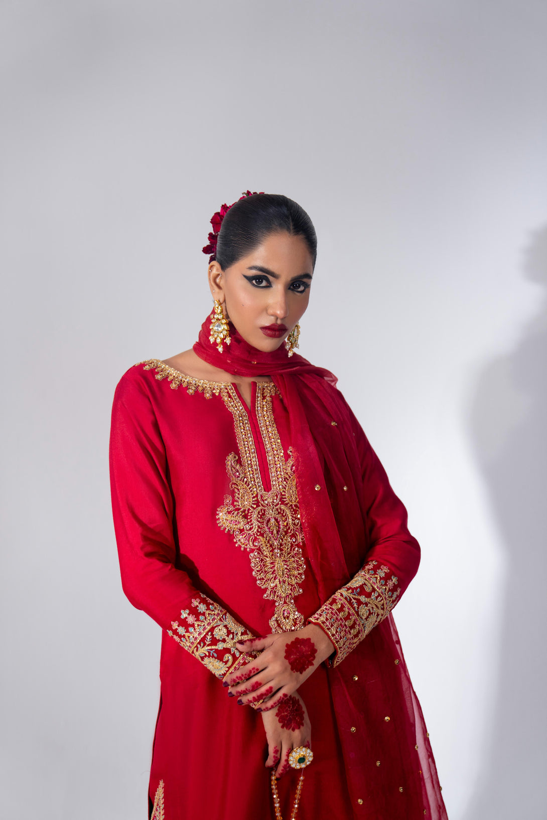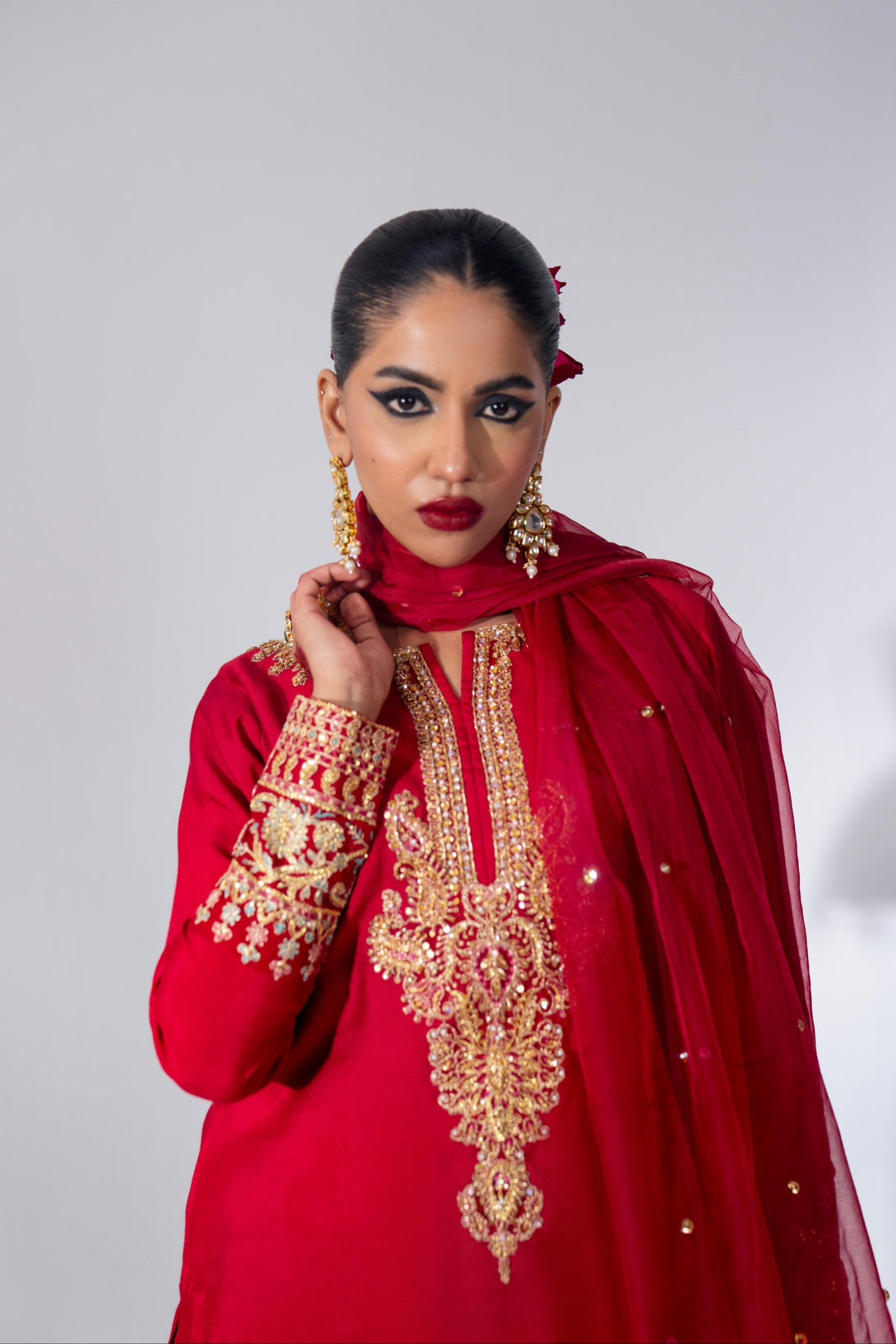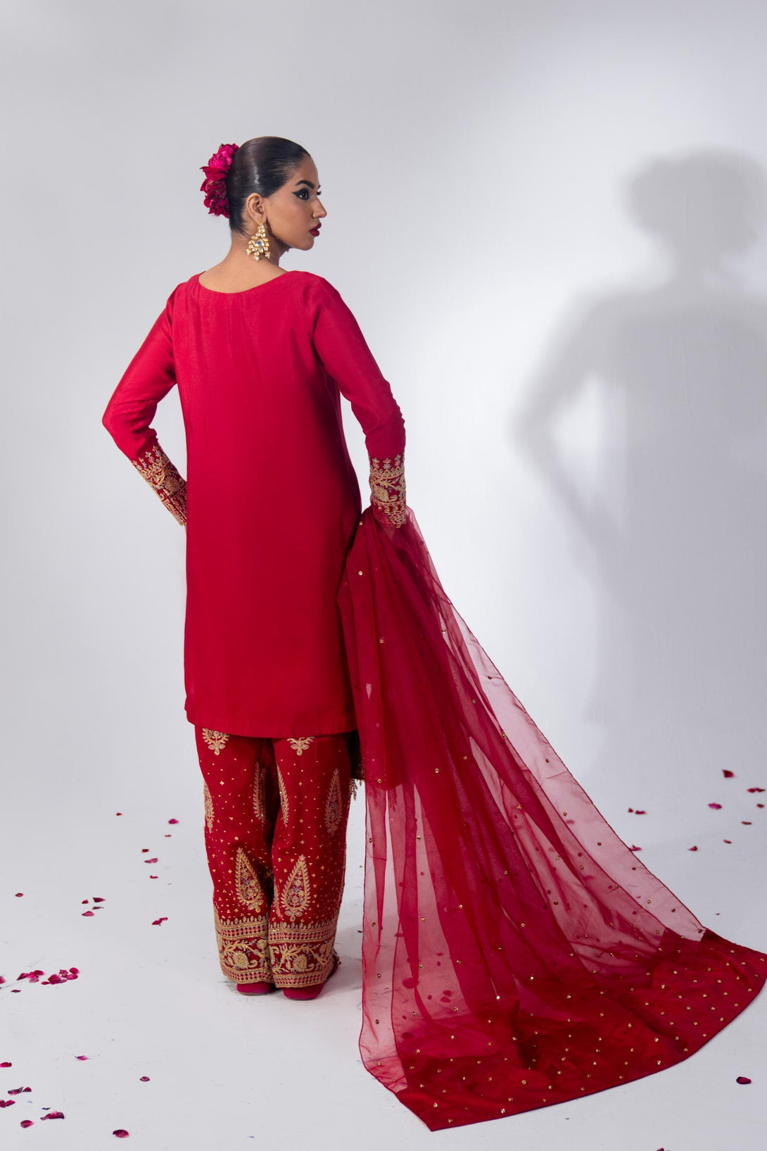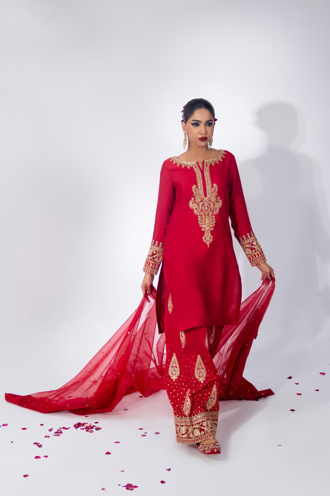 This cool red farshi shalwar kameez set is crafted from luxurious Roman Silk, featuring a hand-embellished neckline and intricate embroidery. The farshi shalwar is adorned with traditional ethnic sequin embroidery. It comes with a matching organza dupatta, finished with silk and a dazzling diamante spray. A modern potli bag completes the look with a contemporary flair.