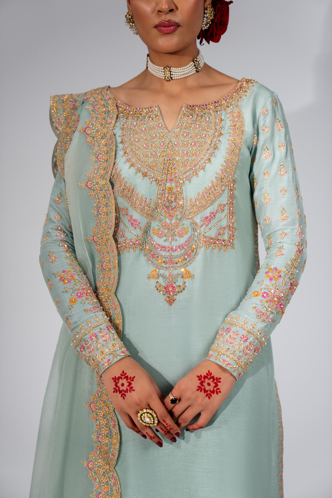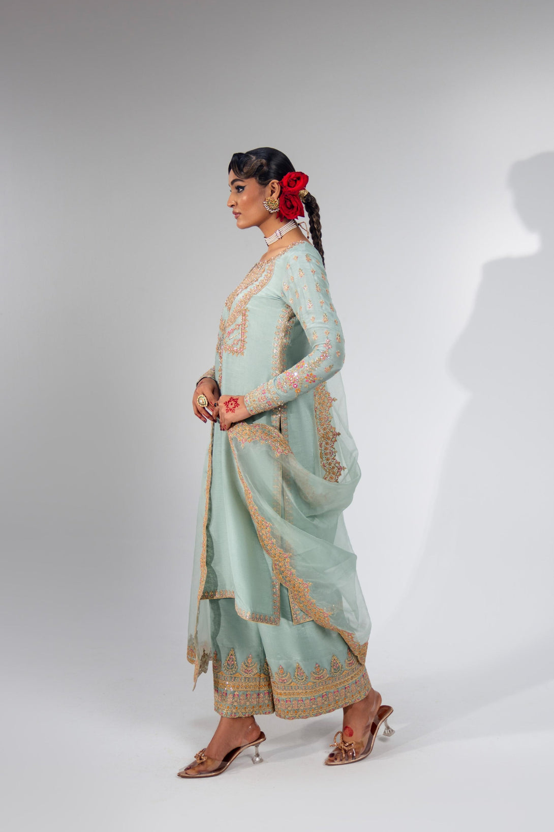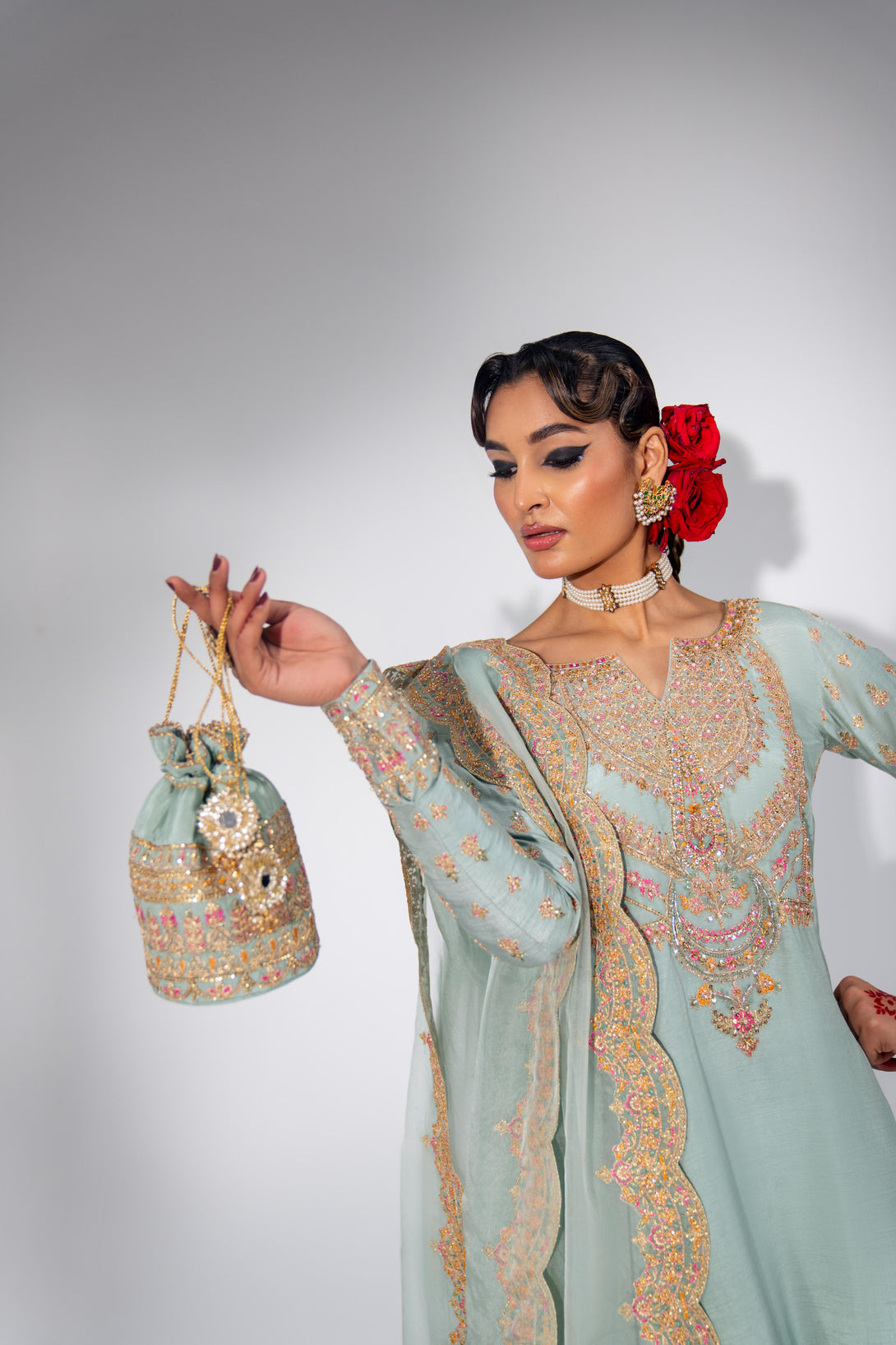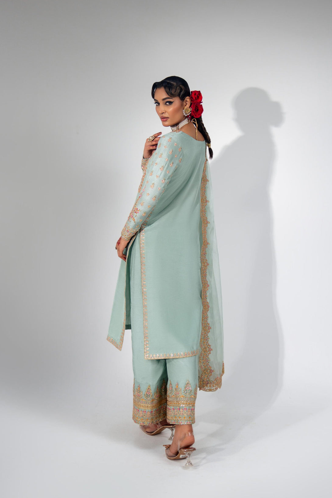 This stunning Pale Turquoise ensemble features a rawsilk shirt with hand embellishment and rich embroidery. It is paired with embroidered pants and an organza dupatta with four-sided scalloped embroidered borders. Add a matching potli bag to complete your festive look.