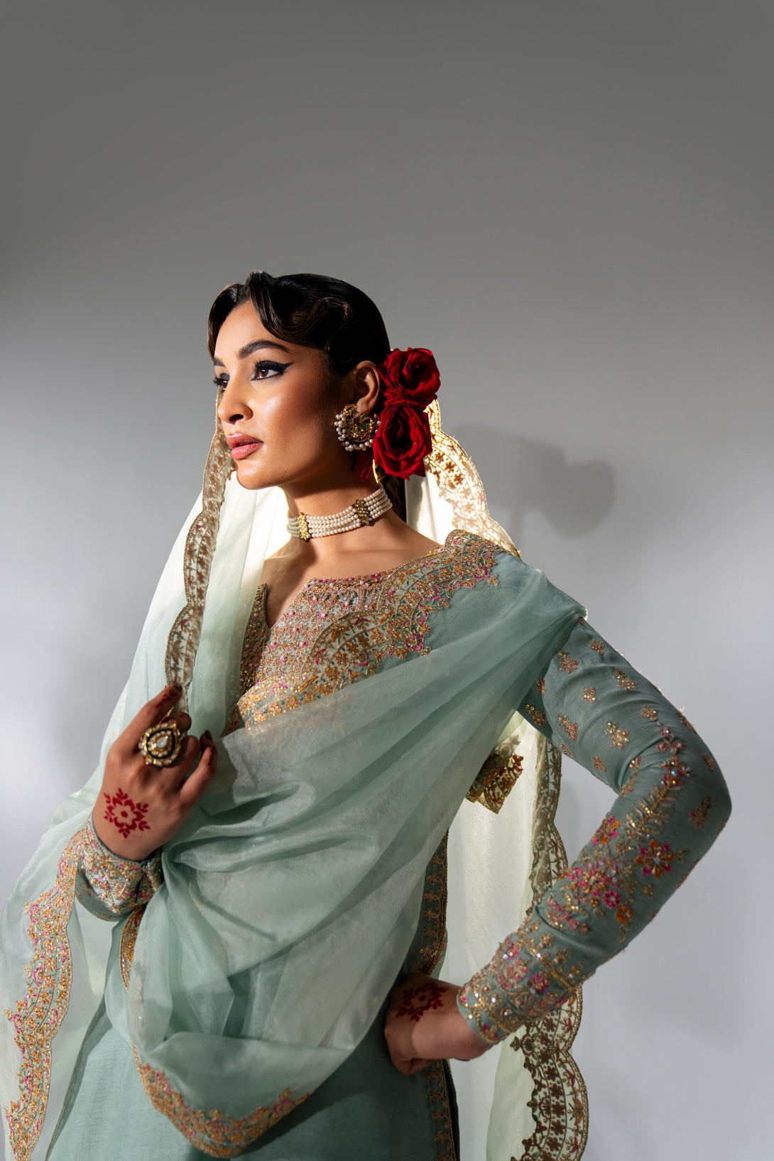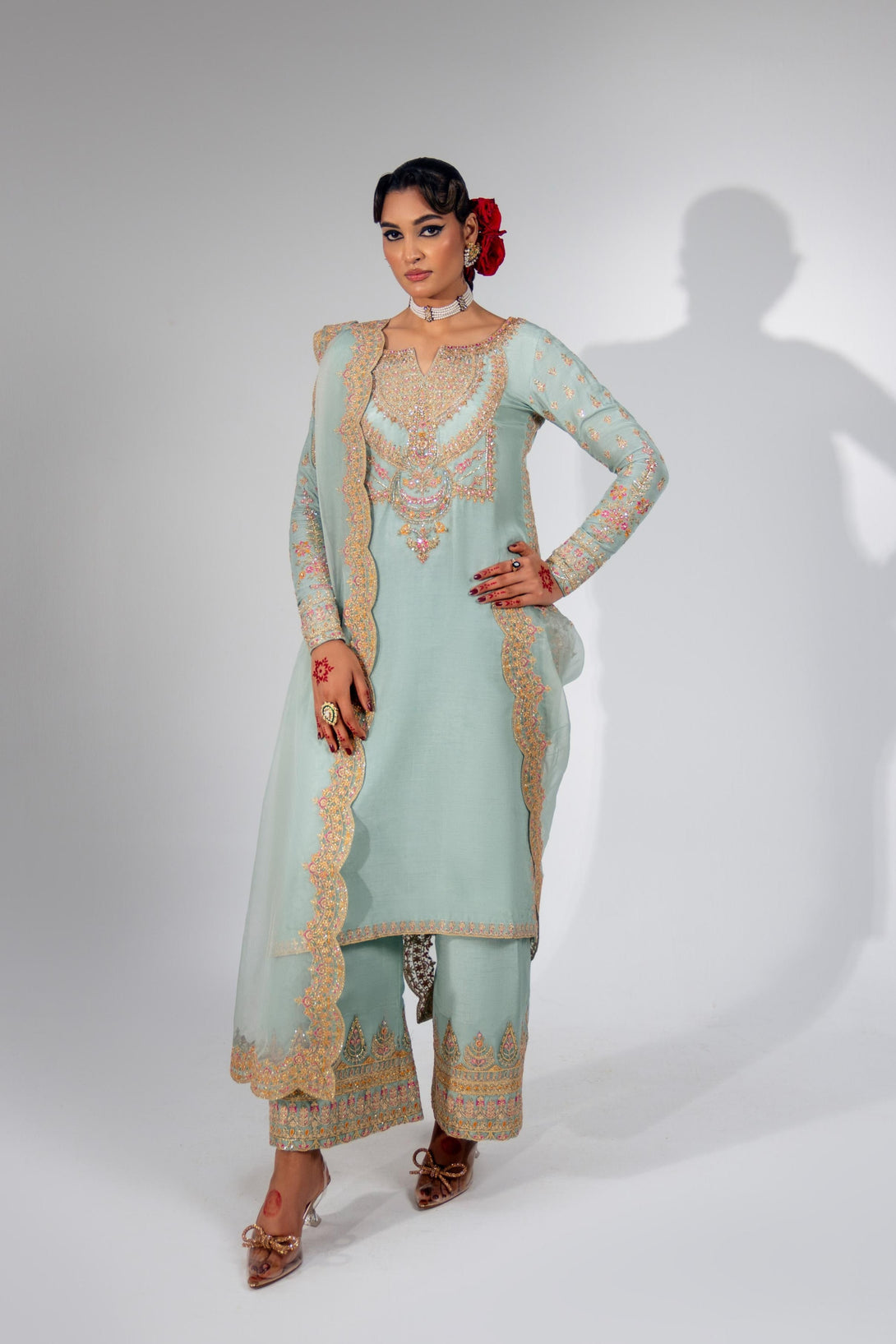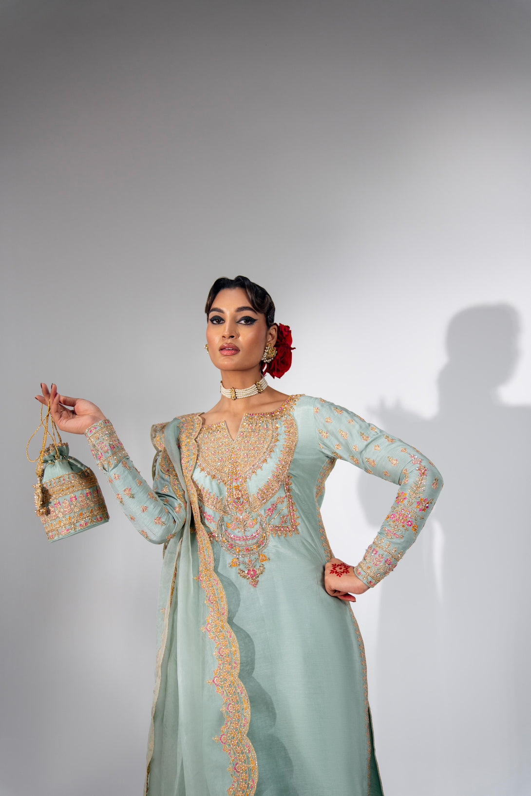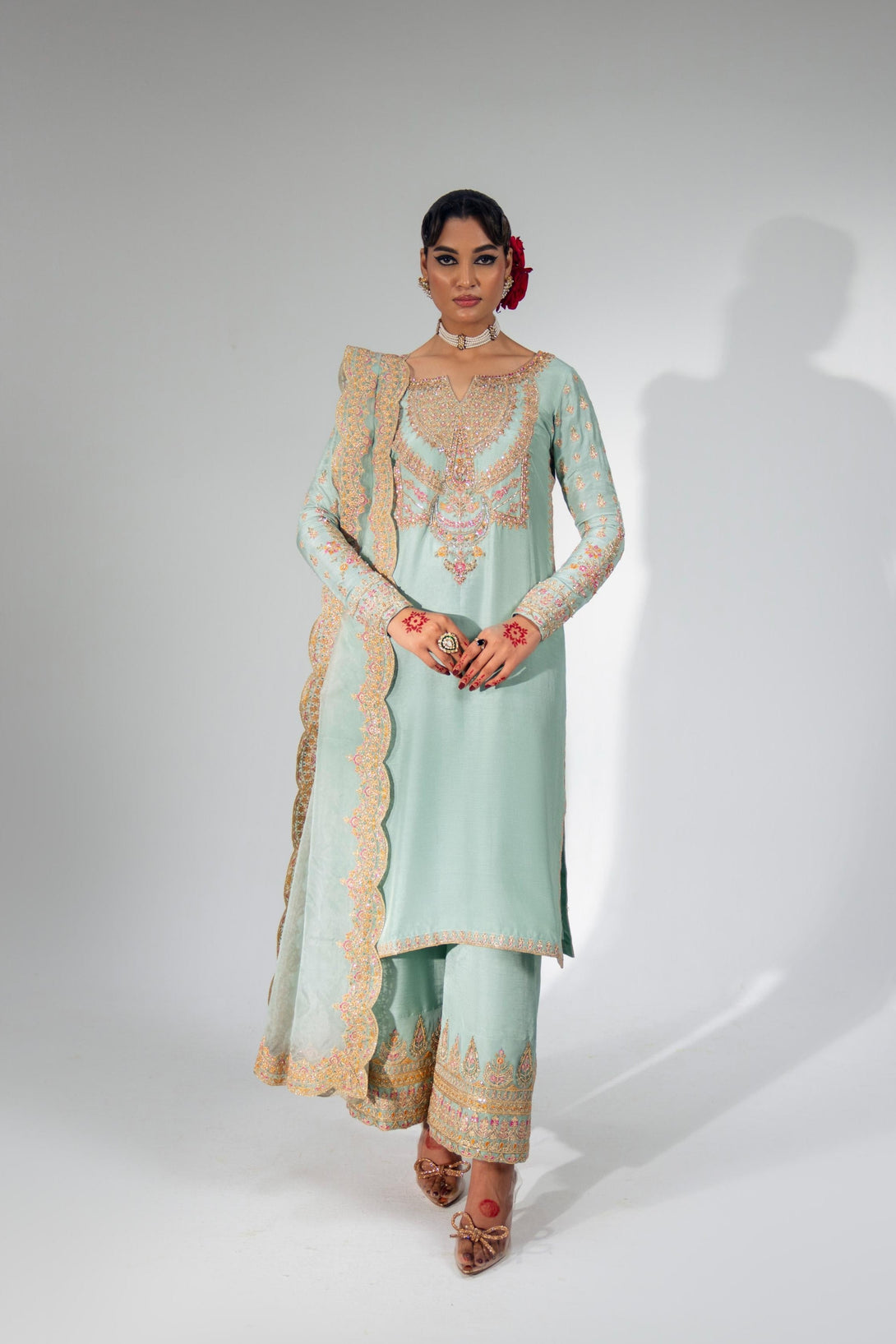 This stunning Pale Turquoise ensemble features a rawsilk shirt with hand embellishment and rich embroidery. It is paired with embroidered pants and an organza dupatta with four-sided scalloped embroidered borders. Add a matching potli bag to complete your festive look.
