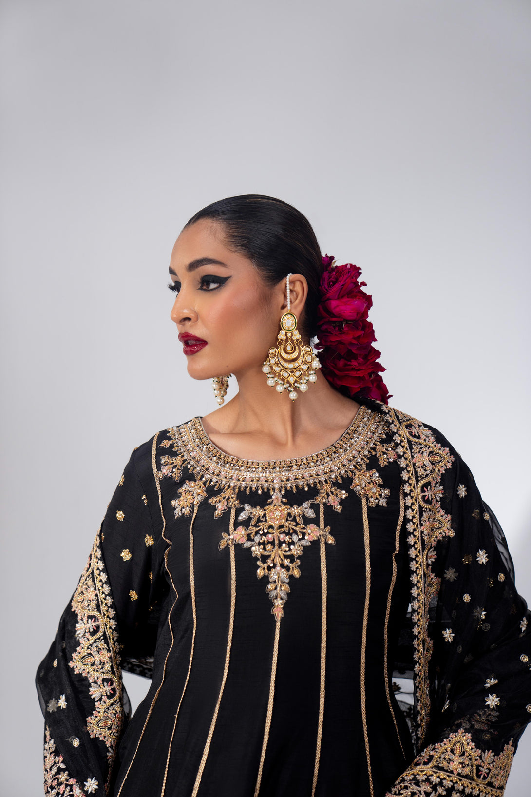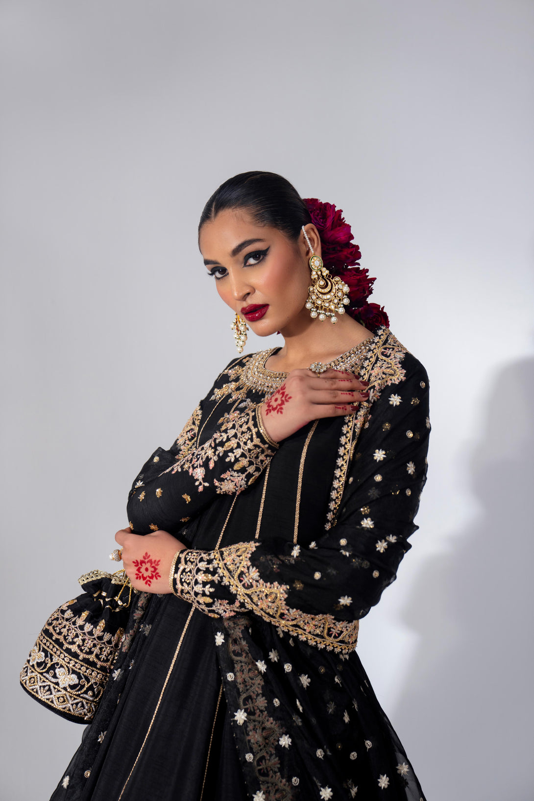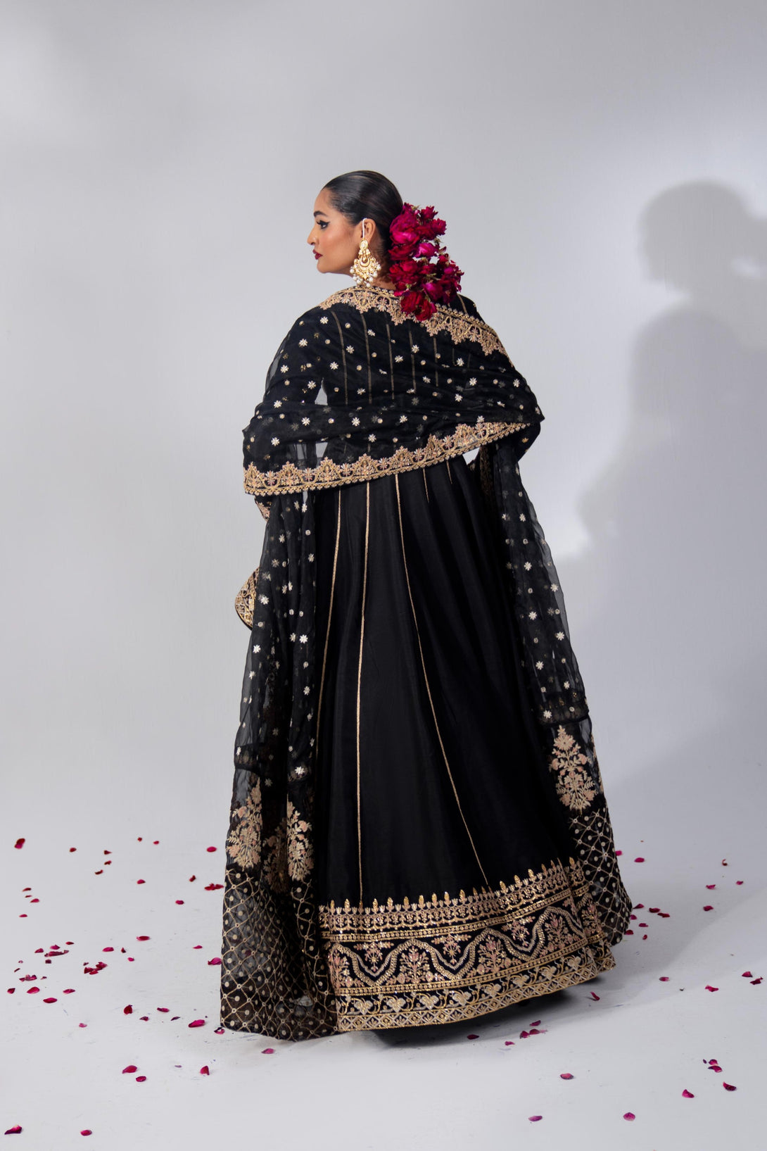 Embrace timeless elegance with this black rawsilk pishwas, hand-embellished and embroidered in a traditional kalidaar silhouette. The neckline features intricate handwork with nakshi, dabka, pearls, crystals, and sitari. Paired with a heavily embroidered composed organza dupatta, this ensemble exudes classic charm. Add a matching potli bag to complete the look.
