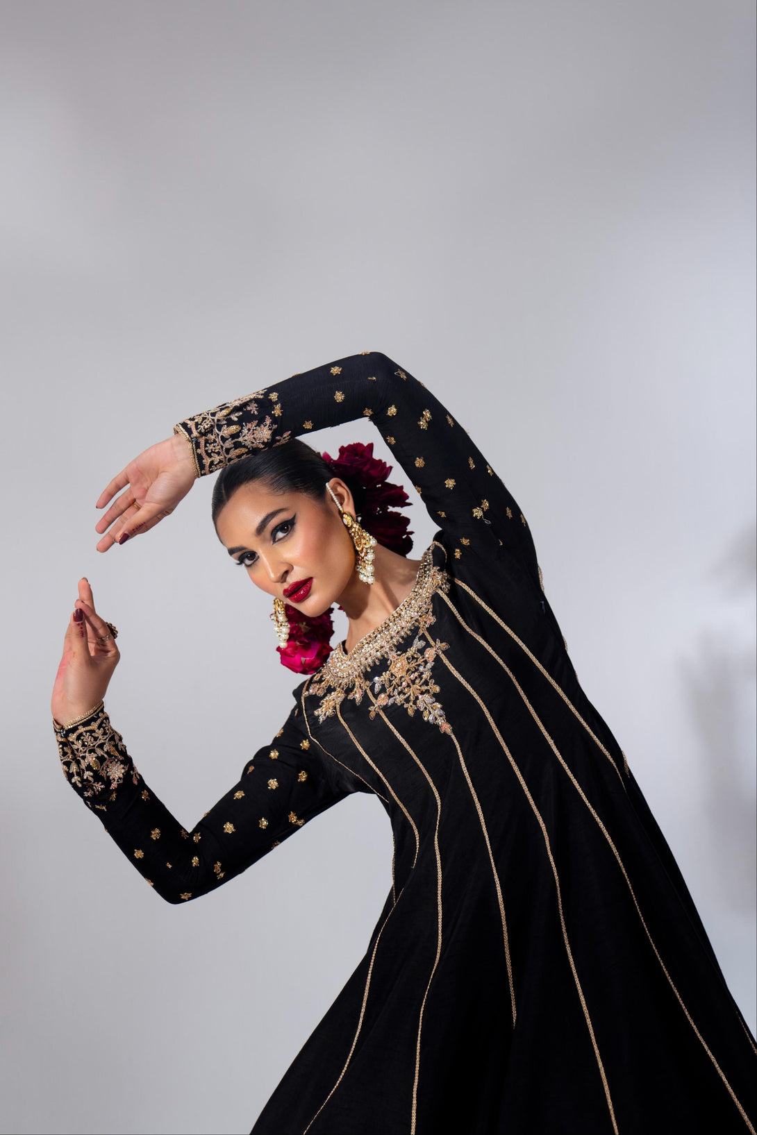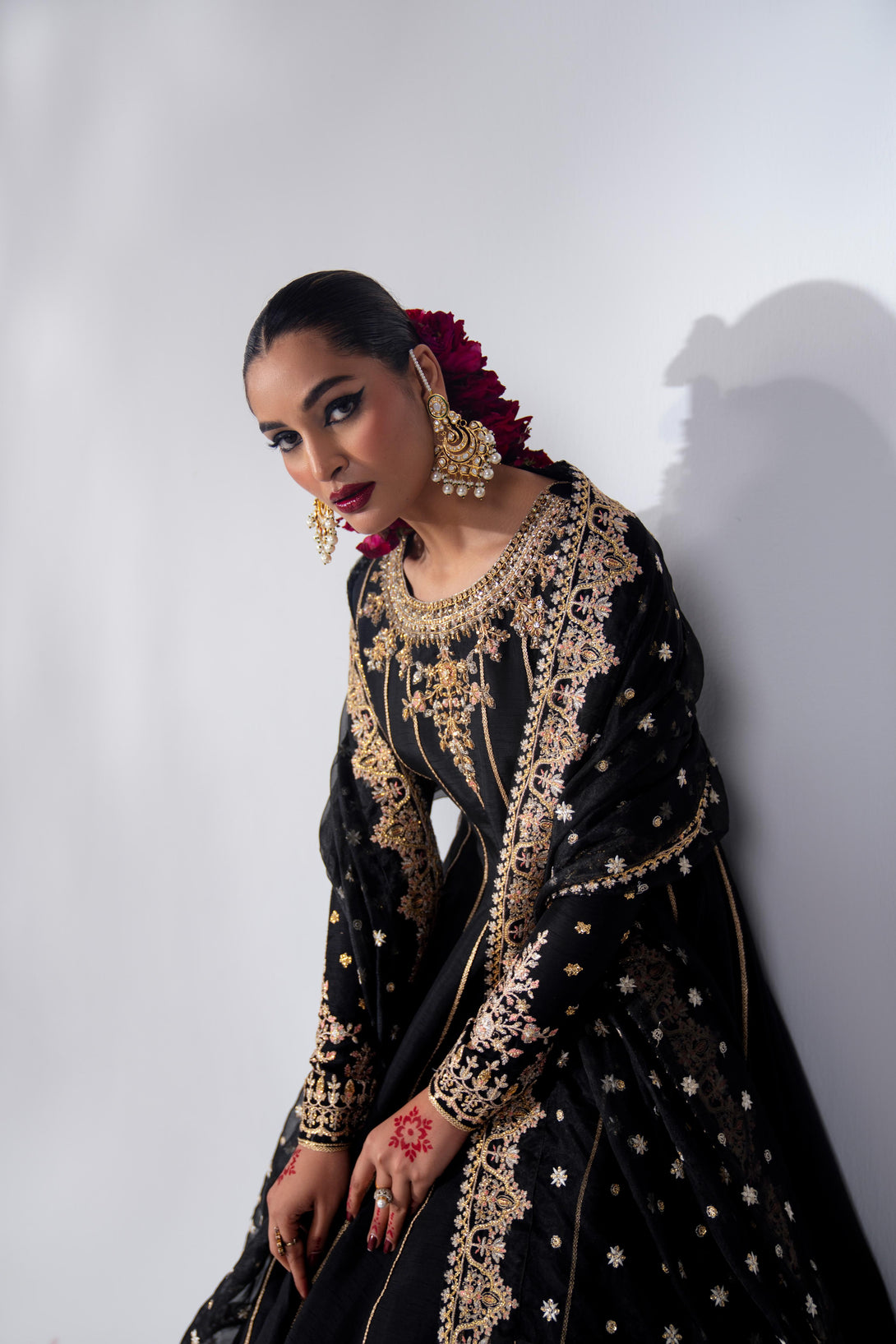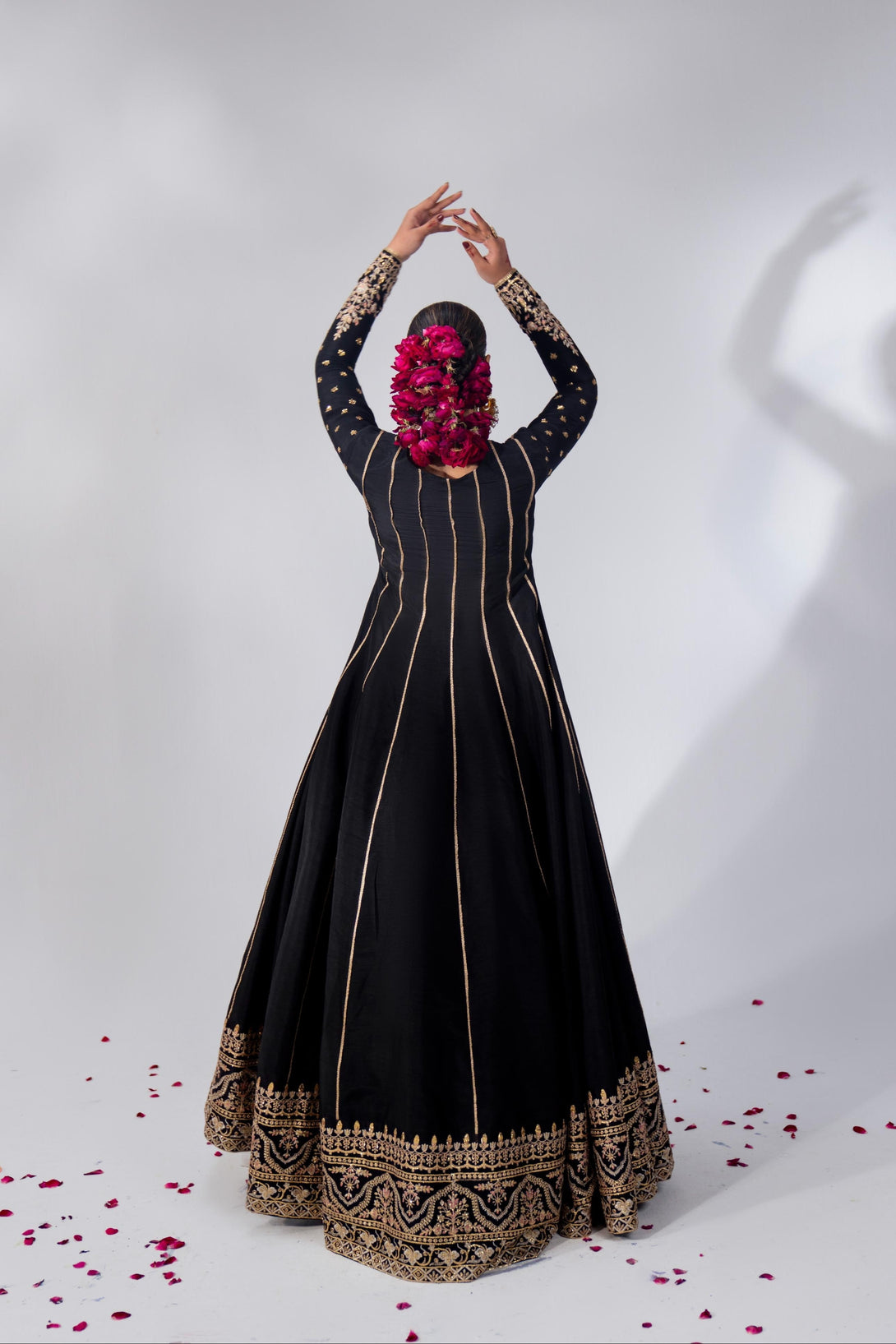 Embrace timeless elegance with this black rawsilk pishwas, hand-embellished and embroidered in a traditional kalidaar silhouette. The neckline features intricate handwork with nakshi, dabka, pearls, crystals, and sitari. Paired with a heavily embroidered composed organza dupatta, this ensemble exudes classic charm. Add a matching potli bag to complete the look.