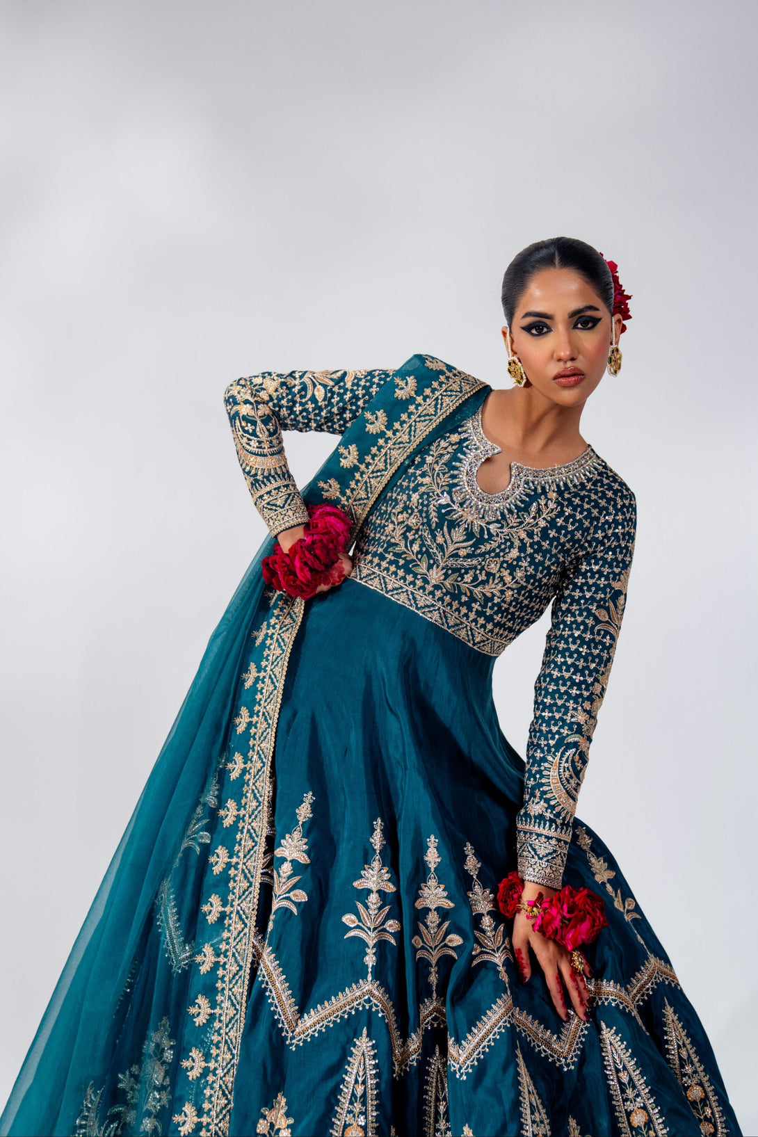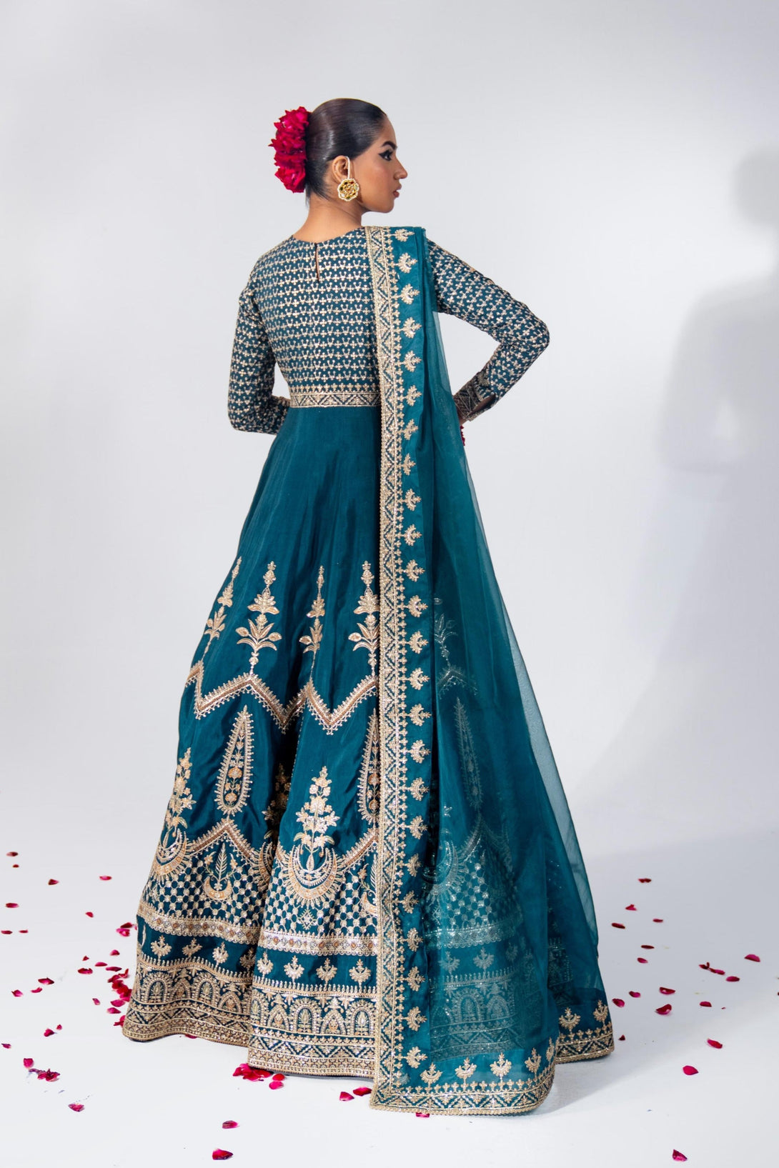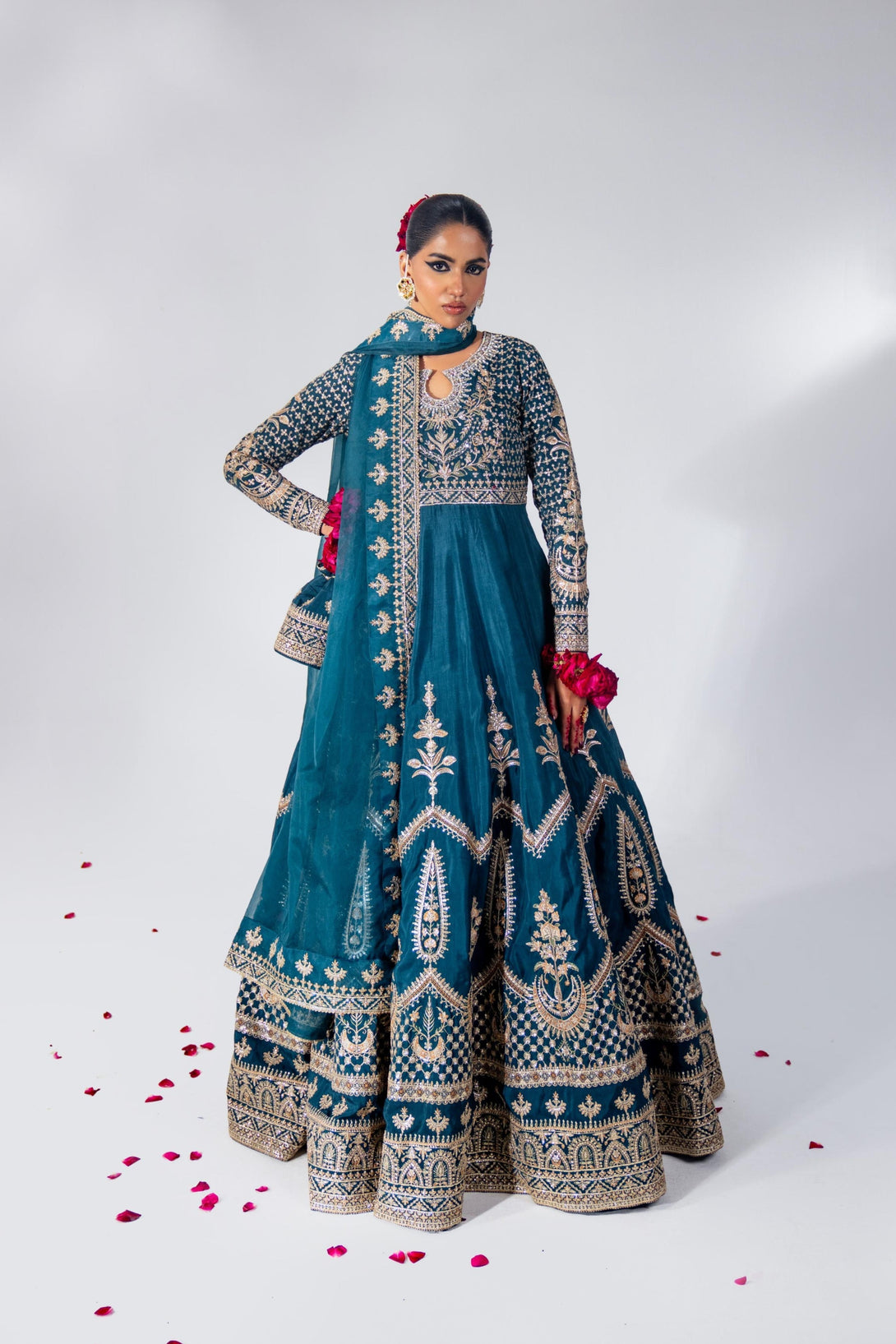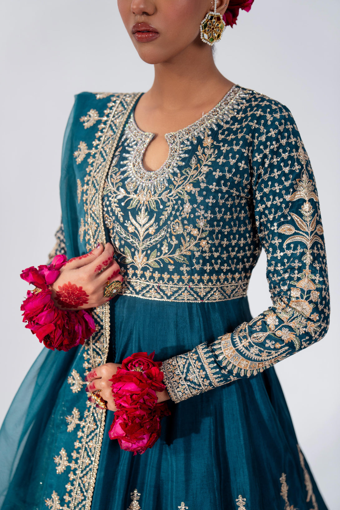 This zinc rawsilk pishwas features rich ethnic motifs, heavy embroidery, and sequins for a striking festive look. The intricately hand-embellished neckline adds refined detail, while the organza dupatta, finished with four-sided borders, complements the ensemble beautifully. Complete your look with a matching potli pouch.