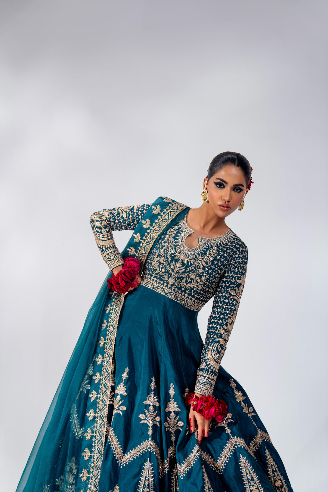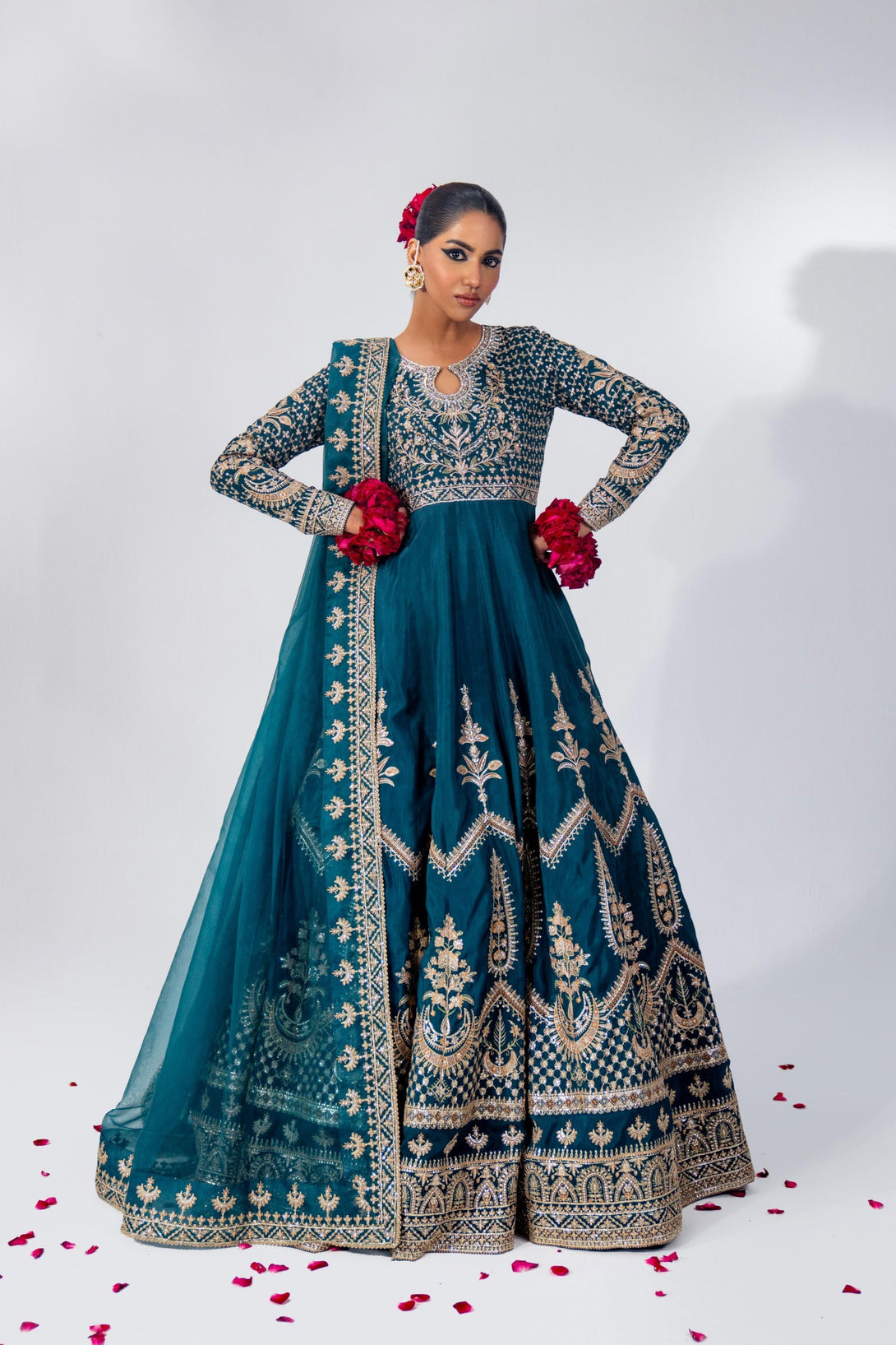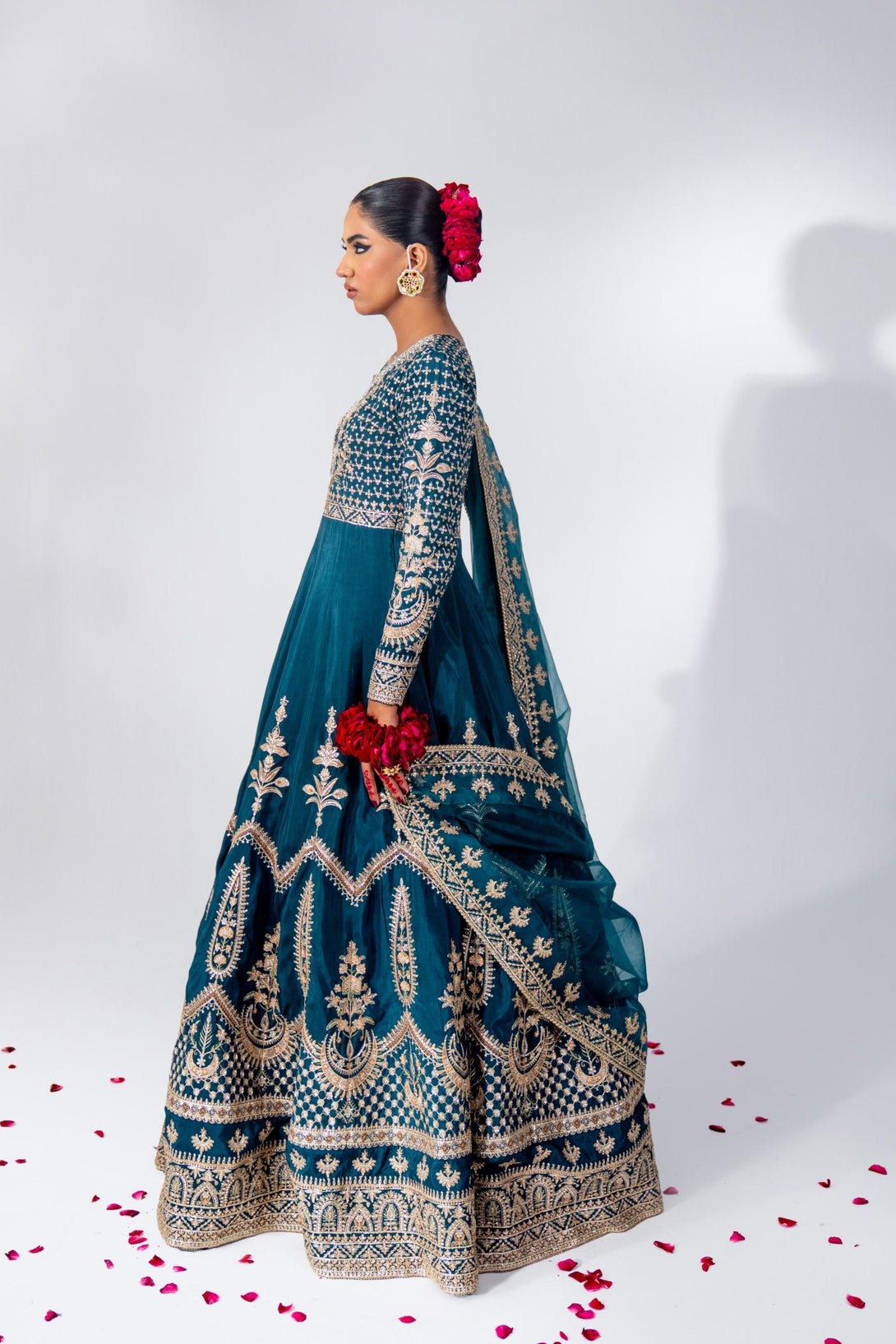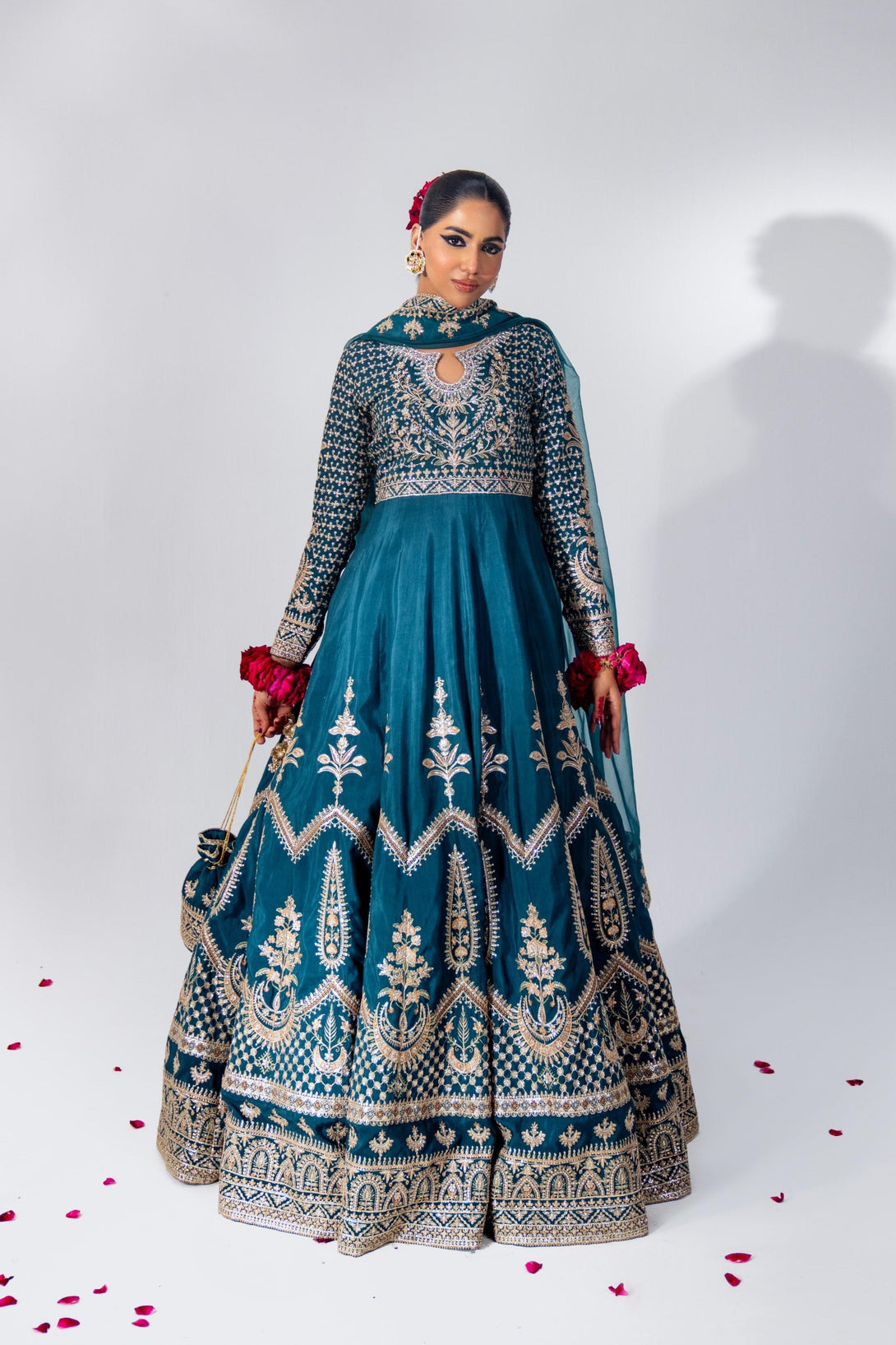 This zinc rawsilk pishwas features rich ethnic motifs, heavy embroidery, and sequins for a striking festive look. The intricately hand-embellished neckline adds refined detail, while the organza dupatta, finished with four-sided borders, complements the ensemble beautifully. Complete your look with a matching potli pouch.