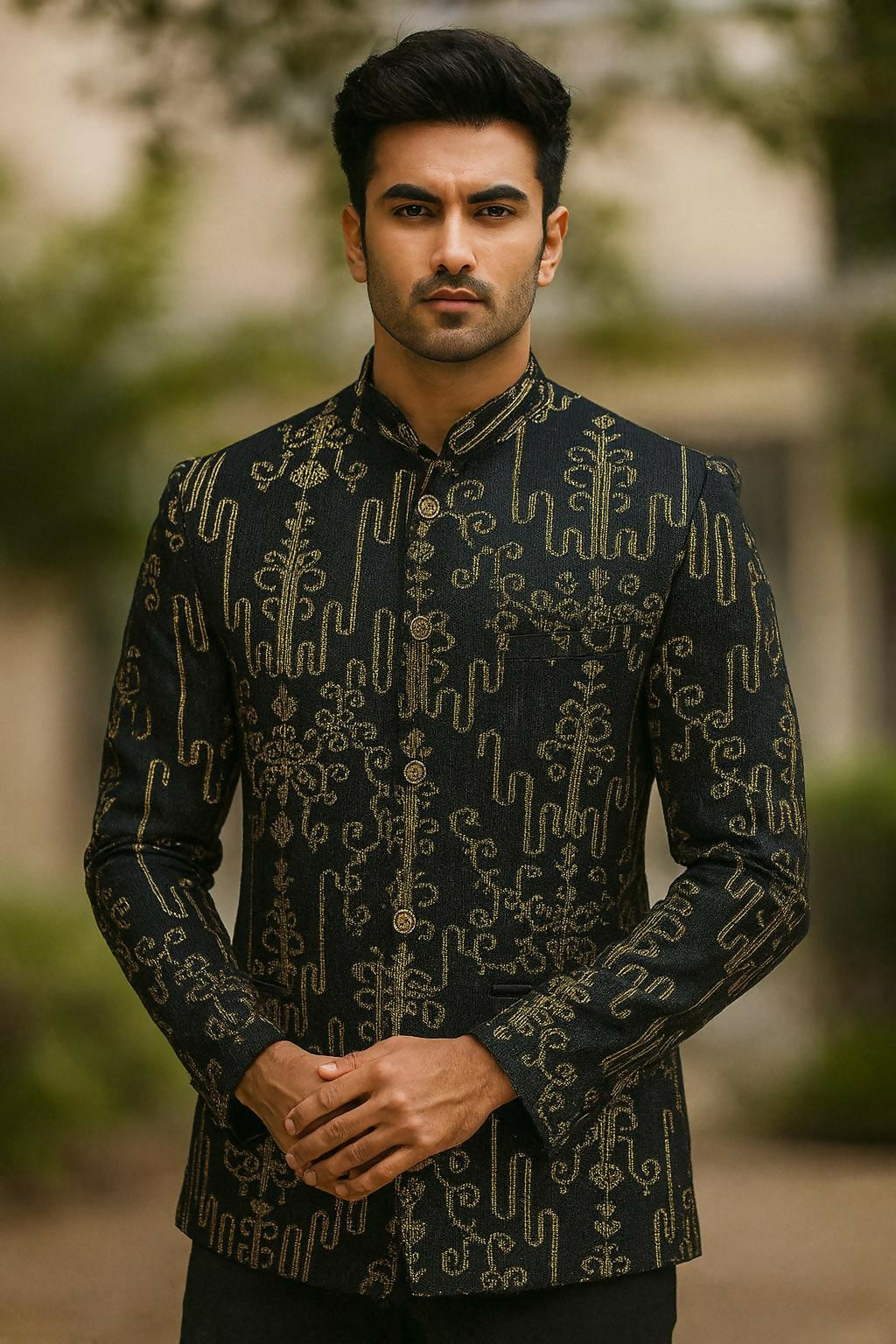 Elevate your style with this premium black princecoat, designed with intricate golden embroidery that blends tradition with modern sophistication. Perfect for weddings, formal gatherings, and festive occasions, this outfit brings an aura of royalty and elegance to any setting.