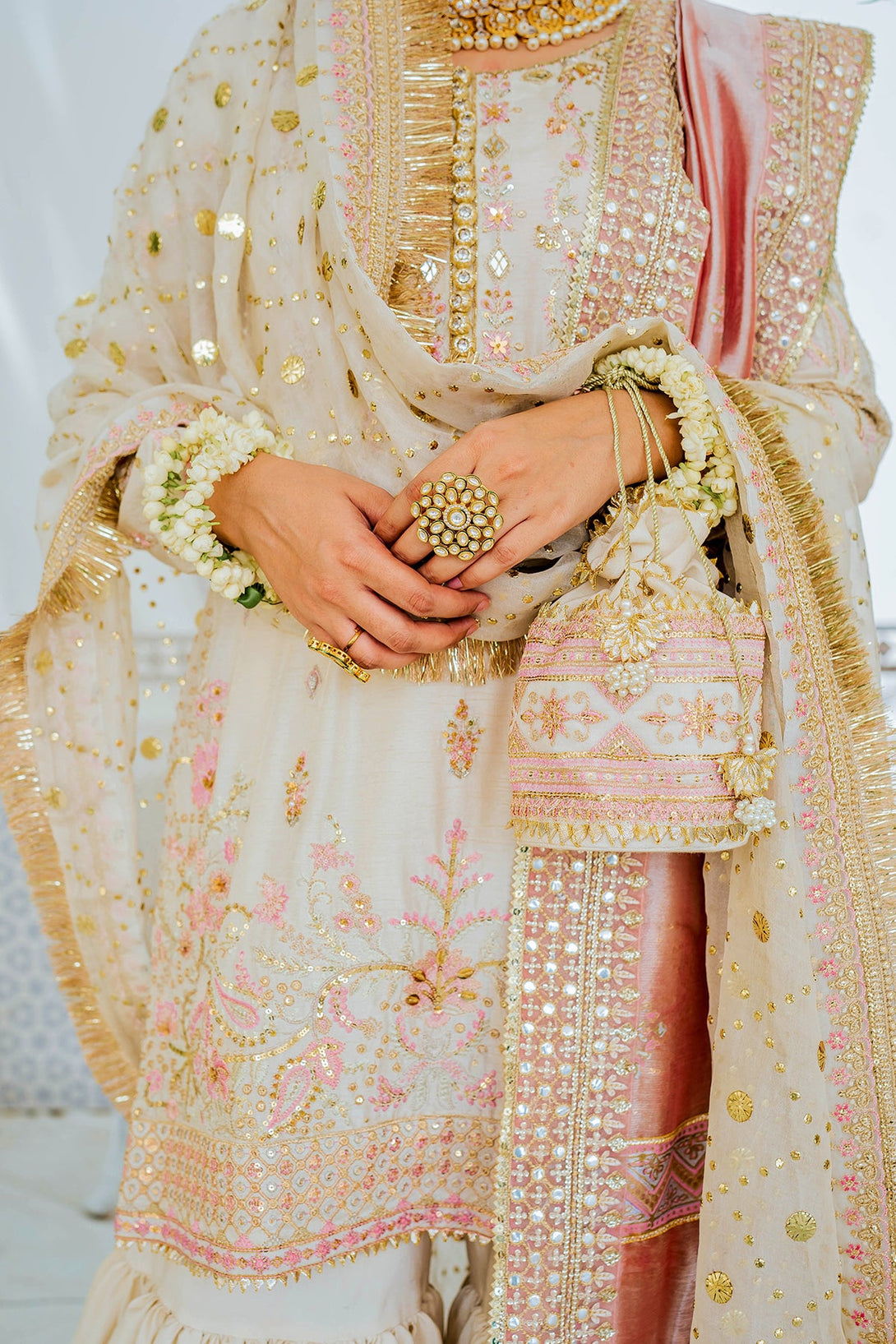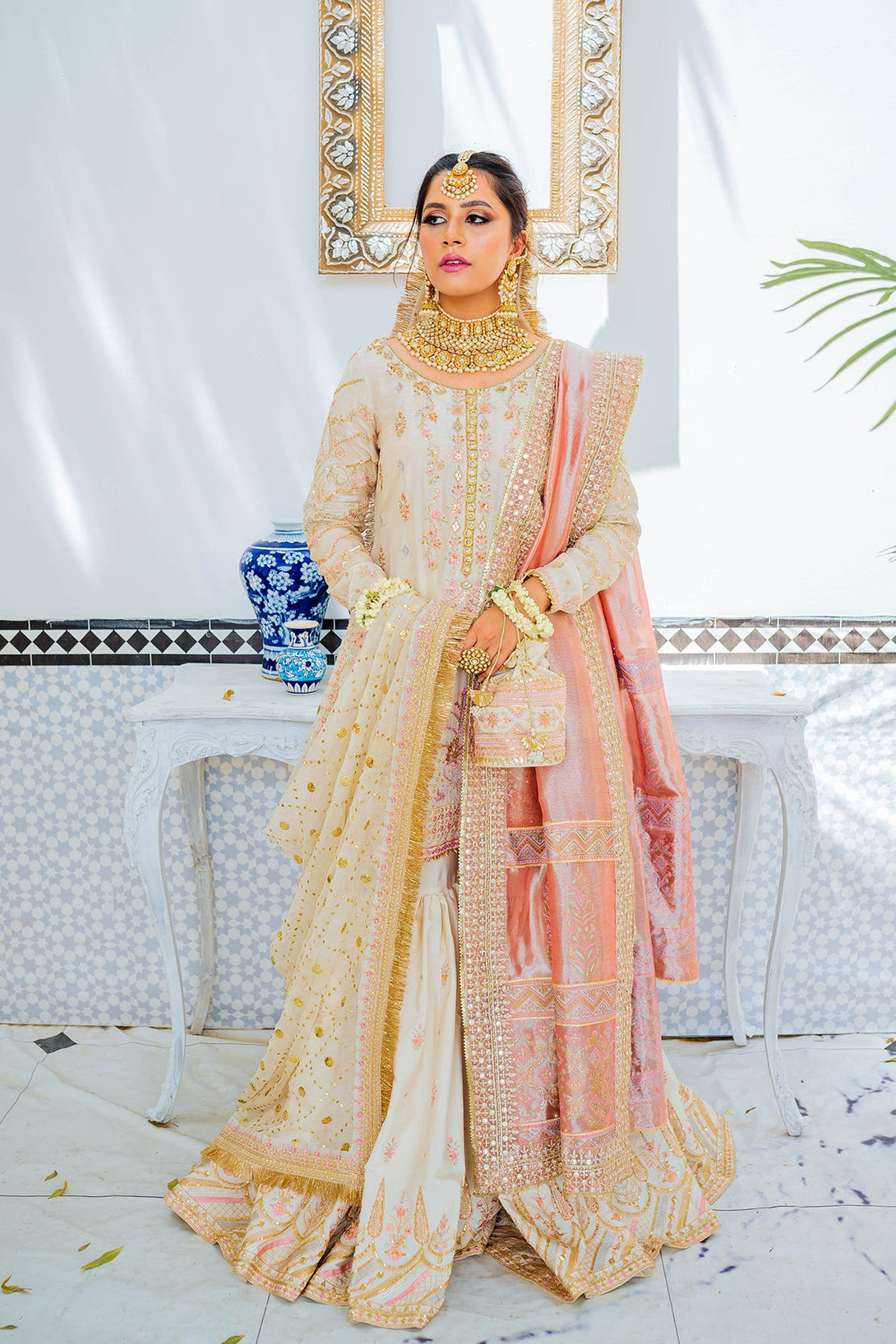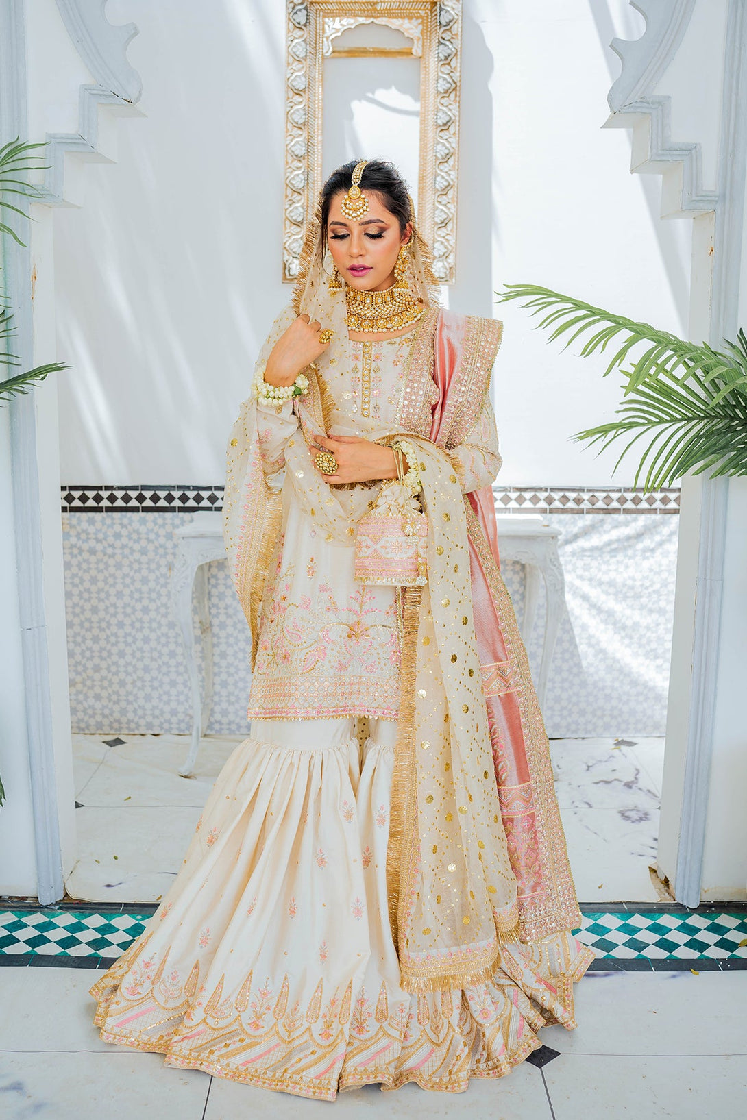 This classic old-school pristine ivory gharara set comprises of a Pure Korean raw silk kameez, heavily embroidered with resham & tilla; hand-embellished with pearls, mirrors, sequins, dabka, nakshi and cut-dana. It is paired with a voluminous finely constructed raw silk gharara, heavily adorned with resham, tilla and sequin embroidery.