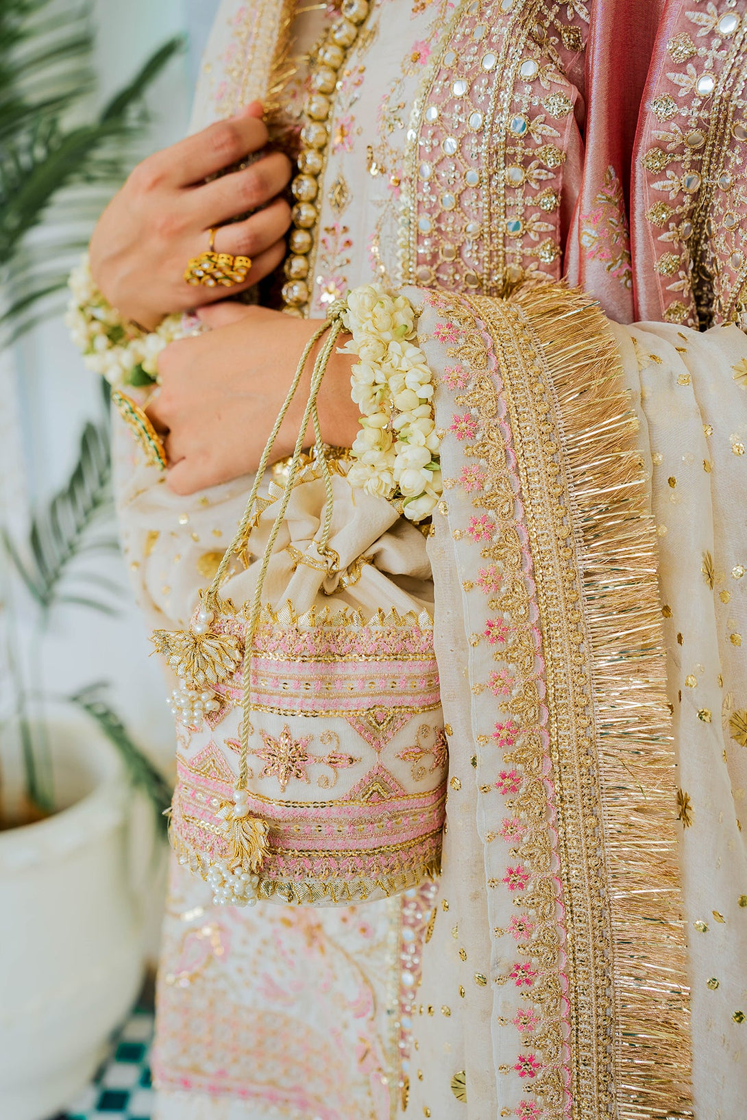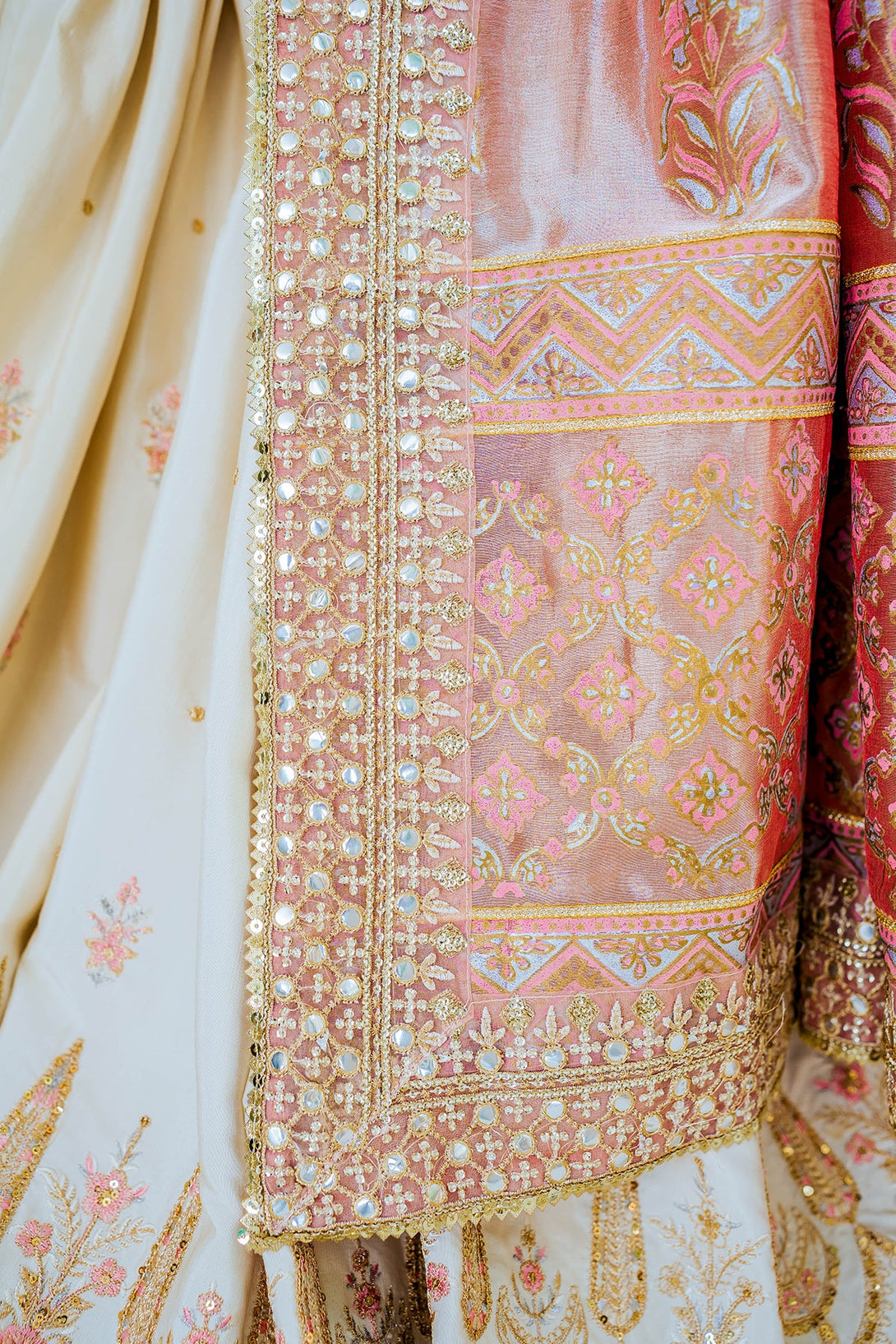 It is paired with our heavily hand-worked mukaish/kamdaani heirloom dupatta, crafted on Pure Organza with embroidered borders and kiran edging on the four sides.