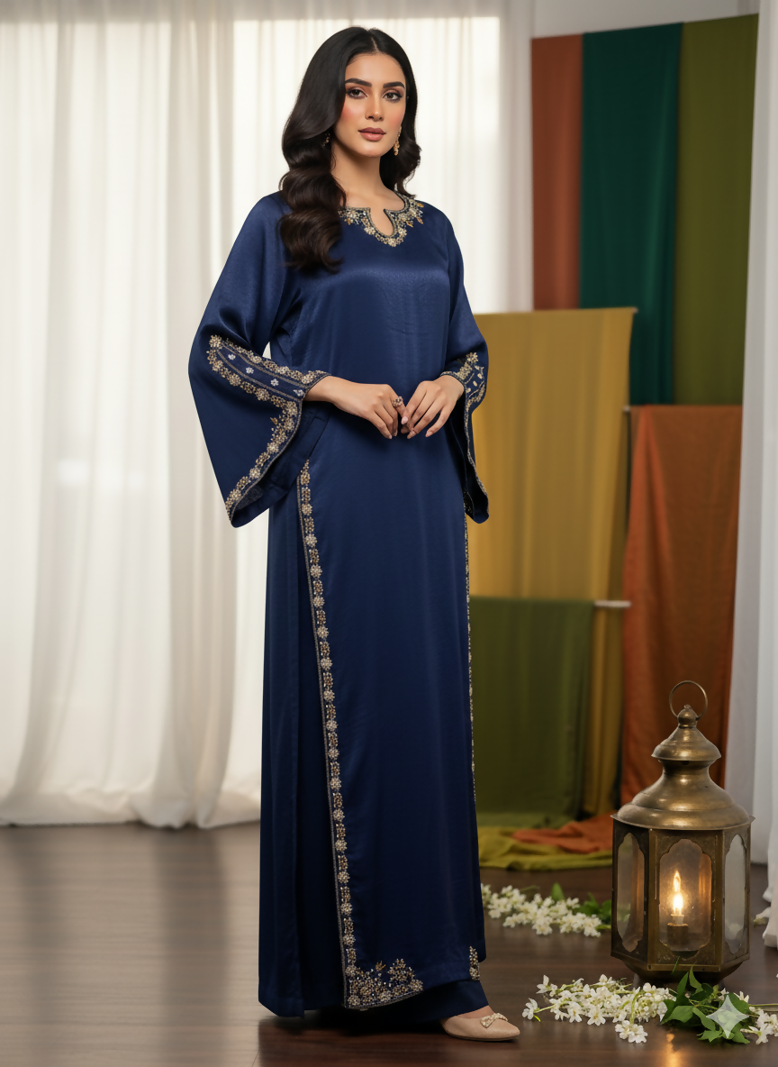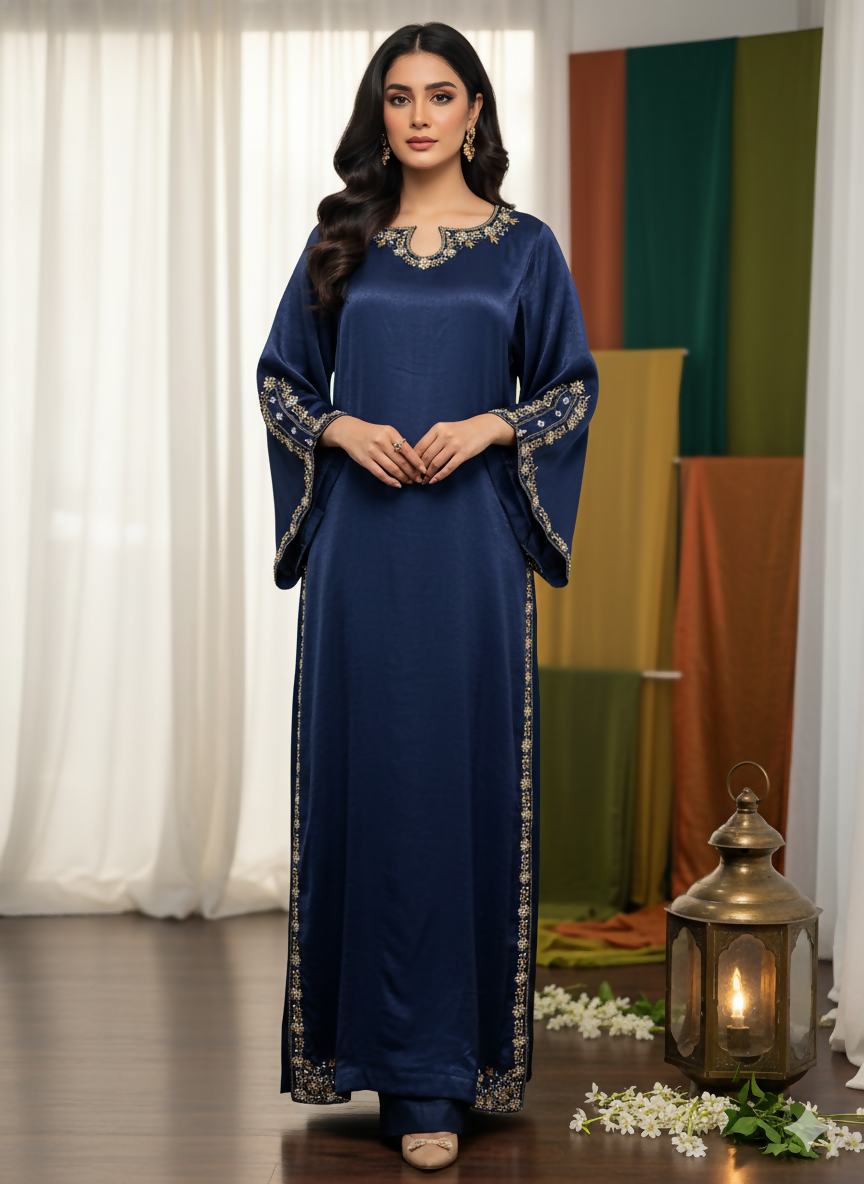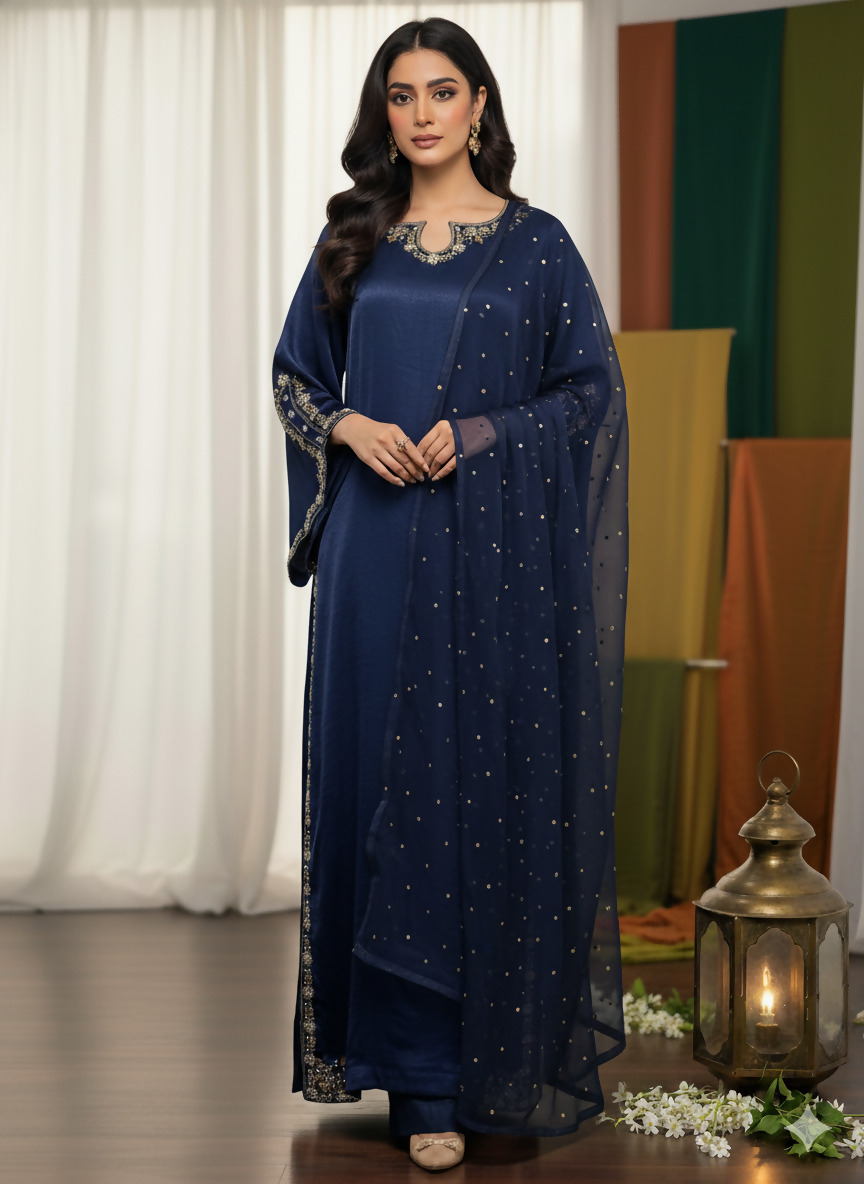 Midnight Bloom* is a velvet silk outfit with hand‑embroidered fabric on the gala, chaak & daman. It has a matching, same‑fabric trouser, and is paired with a chinkled chiffon dupatta with all‑over chan (sequins) on it.