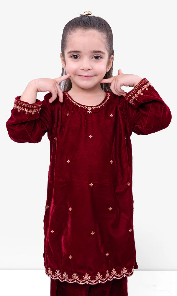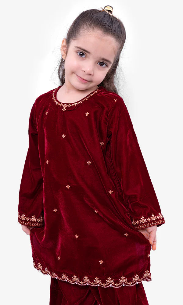 Enhance your child’s wardrobe with this elegant velvet kameez shalwar. Add to cart now to enjoy a ready-to-wear outfit that shines at celebrations and family gatherings.